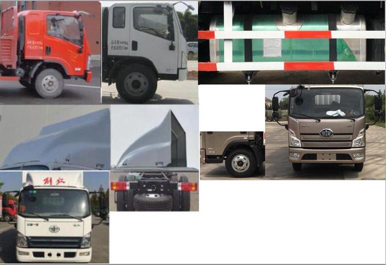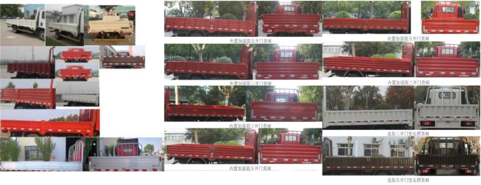 备注 | 选装同系列新前脸驾驶室.选装新的侧面结构的驾驶室.选装导流罩.选装新的后部灯具.选装同系列的排半驾驶室.选装改侧面的排半驾驶室.选装不同的镜子安装位置.选装货箱.仅结构发生改变.货箱前部选装保护板.侧防护及后下部防护装置的材质为R13钢,连接方式为螺栓连接,后部防护离地高度380mm,断面尺寸为120×80mm.油耗值12.0对应发动机CA4DC3-10E5,WP3.7Q102E50.油耗值12.2对应发动机CA4DC3-12E5,WP3.7Q130E50.油耗值12.3对应发动机ISF2.8s5F130.ABS生产厂家/型号:万安科技上海万捷汽车控制系统有限公司/VIE ABS-II.选装新的保险杠和前雾灯.选装双加油口的油箱. |