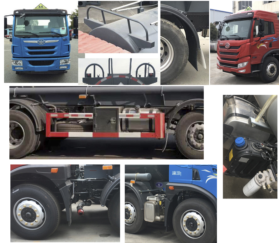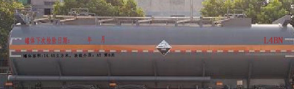 | 备注 | 随底盘选装驾驶室,仅选用具有限速装置、前盘制动、排气管前置、后轴空悬结构及子午线轮胎的底盘,ABS生产厂家/型号:浙江万安科技股份有限公司/VIE ABS-II;危险货物运输车辆的车辆类型:AT型车辆;罐体有效容积为14.45立方米,罐体外形尺寸(mm) (长度×直径) 为7000x1720,对应整车长度10150,轴距1900+4700,后悬2218;罐体外形尺寸(mm) (长度×直径) 为6500x1790,对应整车长度9500,轴距1900+4000,后悬2268;该车可选装顶部围栏形式及轮罩,爬梯可选装;该车安装具有卫星定位功能的行驶记录仪.发动机BF6M2012-22E5,CA6DLD-22E5,CA4DK1-22E5对应的油耗值(L/100km)35.3,35.0,35.2, 类项号:8;整备质量10005对应载质量14800(3人),14865(2人),整备质量9805对应载质量15000(3人),15065(2人);该车加装防飞溅系统.侧、后防护的材质:Q235A;侧防护连接方式:螺栓连接,后防护连接方式:螺栓连接;后防护断面尺寸(mm):120×80,离地高度(mm):500.右侧防护选装带工具箱; 该车后轴为采用空气悬架.该车转向轮已随底盘装备轮胎爆胎应急防护装置.选装排气管前置位置.随底盘选装排气管样式及尿素桶位置. | ||