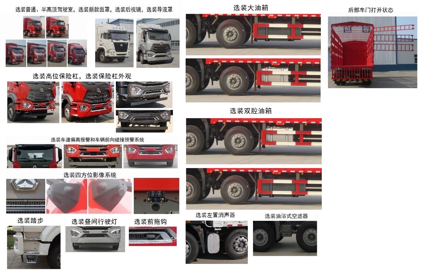 | 备注 | 该车可选装普通或半高顶驾驶室,同时可不选装导流罩;选装高顶驾驶室,同时可不选装导风该车可选装普通或半高顶驾驶室,同时可不选装导流罩;选装高顶驾驶室,同时可不选装导风板。选装新款面罩。选装后视镜。选装改外观的驾驶室。选装昼间行驶灯。选装保险杠外观。选装高位保险杠。选装踏步。选装车道偏离报警和车辆前向碰撞预警系统。选装四方位影像系统。选装前拖钩。该车可选装油浴式空滤器。选装左置消声器。选装大油箱。选装双腔油箱。车厢底板到仓栅顶部的高度为2500mm。驾驶室准乘人数与额定载质量参数一一对应。该车仅选用二类底盘的1800+4600+1350和1800+4575+1400轴距。后悬和轴距参数一一对应。侧面防护装置所用材料材质为Q235A,连接方式为螺栓连接:后部防护装置所用材料材质为Q235A,连接方式为螺栓连接+焊接,断面尺寸为120mm×120mm,离地高度为480mm。该车可选装限速装置,限速79km/h或89km/h。ABS系统型号为446 004 6300,ABS生产企业为威伯科汽车控制系统(中国)有限公司。安装具有卫星定位功能的行驶记录仪。该车选装MC07.24-50、MC07.28-50、MC07.31-50、MC07.34-50、MC07.35-50发动机对应的油耗申报值均为42.5L/100km。选装新款面罩。选装ETC车载装置。 | ||