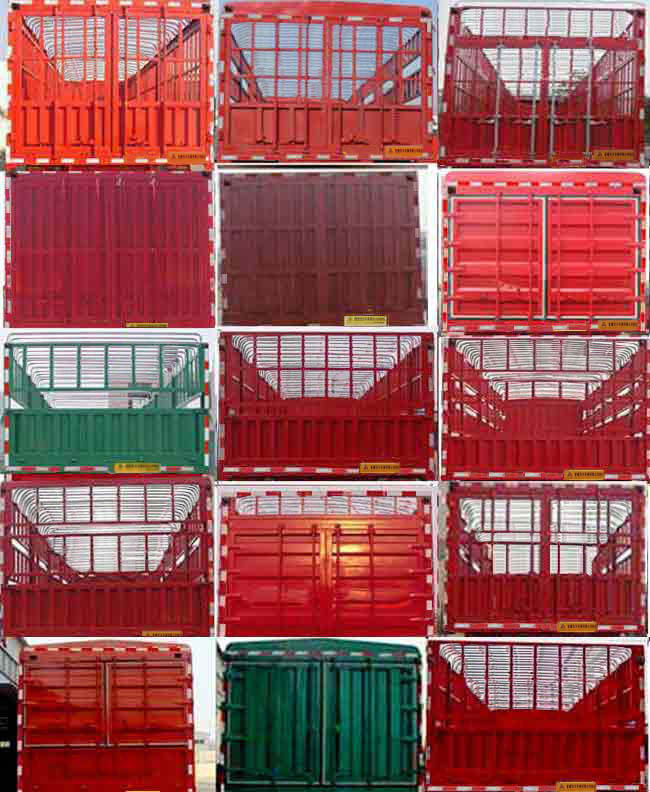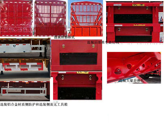| 备注 | 车厢底板到栅栏顶部的高度为:1900mm,2100mm,2300mm,2500mm,2700mm分别对应外形尺寸高度为:3190,3390,3590,3790,3990,后部选装花栏式后门,对开式半封闭后门,对开全封闭样式为横瓦楞,竖瓦楞,方管平板,方管十字花平板后门,选装半封闭前门,整车选装各种仓栅样式为一层仓栅,二层仓栅,三层仓栅,对开门锁杆,对开门半截锁杆,侧面选装5开门,6开门。整车货厢栏板选装竖瓦楞,方管平板,方管十字花样,在前回转半径内选装篷布框及前爬梯为选装件,选装大梁异形孔,选装后部推车器结构,选装侧面无工具箱,选装后整备质量变化在3%范围内,车长/货箱内尺寸/轴距/后悬/离去角,对应关系(mm):13000/12900/6850+1310+1310/2230/13.3;13000/12900/6850+1310+1310/2130/13.9;12500/12400/6550+1310+1310/2030/14.5;12500/12400/6550+1310+1310/1930/15.2;12000/11900/6250+1310+1310/1830/15.9;12000/11900/6250+1310+1310/1730/16.8;ABS型号CM2XL-4S/2M,生产厂家:广州科密汽车电子控制技术股份有限公司,选装ABS生产厂家:威伯科汽车控制系统(中国)有限公司型号:400500XXX0.,侧防护材质Q235,选装铝合金材质,为螺栓连接,后防护采用Q235,与车架连接方式为焊接. 后防护离地高度为490mm,断面为140mmX60mm | ||