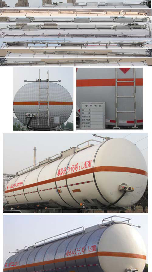 | 备注 | 罐体有效容积42立方米,罐体外形尺寸( mm):保温外罐长:12610外径前φ2260/后φ2360; 内罐:长12430外径前φ2058/后φ2158.危险货物运输车辆的类型为:FL型,危险品类项号为:3.选装侧面防护装置、外蒙板、挡泥板.该车装空气悬架.爬梯可在罐体前部或后部或前后都装,选装罐体顶部护栏及走道结构.选装后部或侧面尾部操作箱(或工具箱).选装牌照板,灯具,尾部标志板位置.ABS厂家、型号:威伯科(上海)管理有限公司,4005000880或广州瑞立科密汽车电子股份有限公司,CM2XL-4S/2K(4S/2M)或浙江万安科技股份有限公司,VIE-TABSⅡ或广州市西合汽车电子装备有限公司,XH-GQ4S2M-E01或翰德汽车产品(苏州)有限公司,364570001.EBS厂家、型号:克诺尔商用车系统企业管理(上海)有限公司,K11061XVXX或瀚德汽车产品(苏州)有限公司,4S2M或威伯科(上海)管理有限公司,4801020640或浙江万安科技股份有限公司,VIE TEBS-I.侧防材料为铝合金,螺栓连接;后防材料为铝合金或Q235,螺栓连接后.断面尺寸80mm×150mm,离地高495mm.采用适用于牵引危险品运输半挂车的牵引车. | ||
