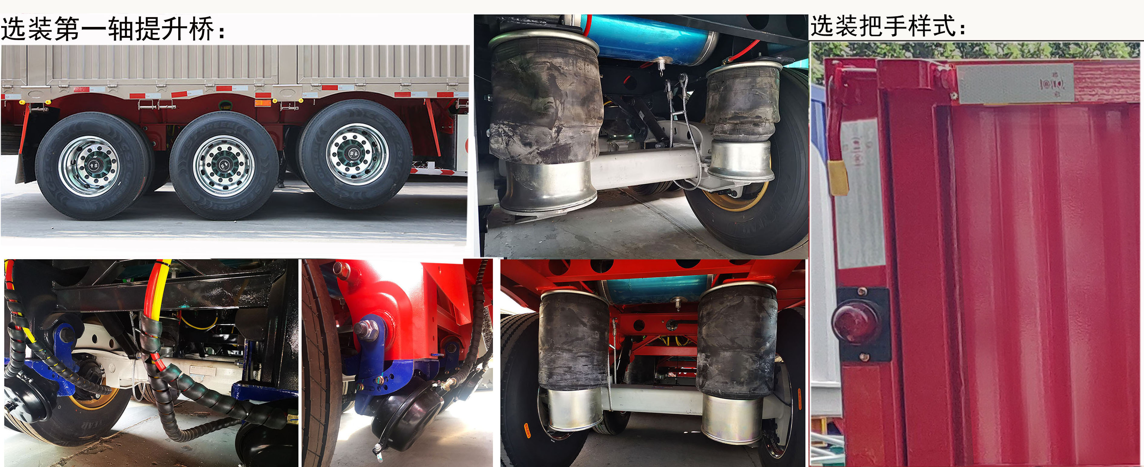 | 备注 | 整车栏板选装竖瓦楞,横瓦楞,方管十字花样式;立柱可选内插和外插;选装前档板结构;选装大梁异形孔结构;选装后组合灯/雾灯为方灯或圆灯样式;选装合页样式;车辆可选装第一轴提升桥,仅允许空载状态下提升;选装把手样式;ABS生产企业:广州瑞立科密汽车电子股份有限公司,威伯科汽车控制系统(中国)有限公司,浙江万安科技股份有限公司,山东纳赫汽车零部件有限公;ABS型号:CM2XL-4S/2M,4005000880,VIE-TABSⅡ,DZ11-4S2M;EBS生产企业:山东纳赫汽车零部件有限公司,广州瑞立科密汽车电子股份有限公司;EBS型号:DZ2001,CM-EBS;侧防护装置材料为铝合金或Q235,与车辆连接方式为螺栓连接;后防护装置材料为Q235,与车辆连接方式为焊接;截面尺寸:140x50,离地高度为500mm.车长/半挂车牵引销到车辆最前端距离/轴距/后悬(mm)对应关系为:当车长为13000时,1120/6880+1310+1310/2380;1230/6800+1310+1310/2350;1380/6650+1310+1310/2350;当车长为:12500时,1300/6480+1310+1310/2100;当车长为:12000时,1300/6280+1310+1310/1800. | ||