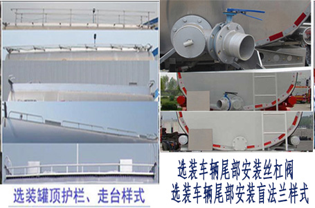 | 备注 | 罐体有效容积34.5立方米; 罐体外型尺寸(长×长轴×短轴(前端/后端))mm:9600×2520×1750/1900;ABS生产厂家:广州瑞立科密汽车电子股份有限公司,广州市西合汽车电子装备有限公司,梁山顺安达汽车科技有限公司;ABS系统控制器型号:CM2XL-4S/2K(4S/2M),XH-GQ4S2M-E01,SAD-ABS4S/2M;长度,牵引销到车辆最前段的距离,轴距和后悬的关系:10100=1200+4730+1310+1310+1550=1300+4630+1310+1310+1550;侧防护材料:碳钢Q235或铝合金,连接方式:螺栓连接;后防护断面尺寸/材质/连接方式:120×68mm/Q235B或/铝合金/螺栓连接,离地高度为500mm;选装轻型行走机构时整备质量为7500kg,对应额定载质量为32500kg.选装铝合金侧后防护样式;选装车辆前部带爬梯样式;选装车身侧面和正面企业logo.选装罐顶护栏及走台样式;选装车辆尾部安装丝杠阀;选装车辆尾部安装盲法兰样式; | ||