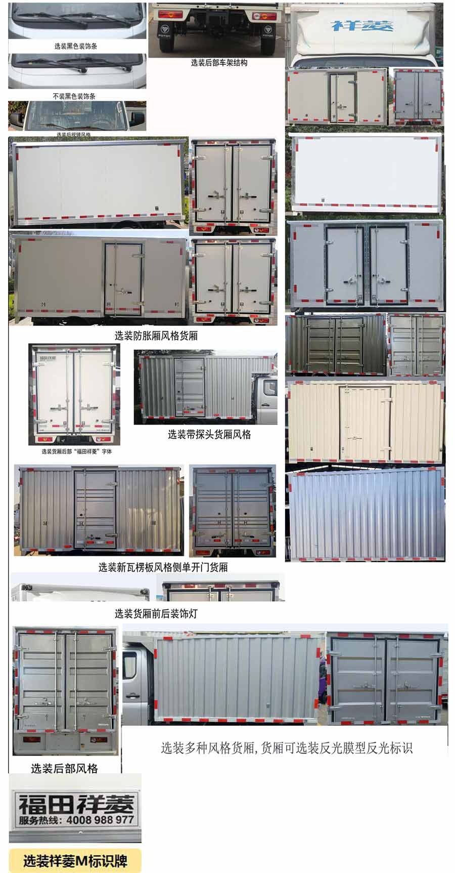| 备注 | 货厢顶部封闭不可开启,选装带前雾灯及昼间行驶灯造型,选装不带前雾灯及昼间行驶灯造型,选装带导流罩,选装不带探头,选装彩涂板单侧开门风格货厢,选装彩涂板不带侧开门风格货厢,选装彩涂板侧双开门风格货厢,选装瓦楞板侧双开门风格货厢,选装瓦楞板单侧开门风格货厢,选装瓦楞板不带侧开门风格货厢,可选装黑色装饰条,可选装不带黑色装饰条,发动机DAM15KR,DAM16KR对应的油耗值分别为7.4L/100km,7.5L/100km,分别对应最高车速100km/h,110km/h.ABS系统控制方式是双参数控制,ABS系统控制器型号是YF9,ABS系统控制器生产企业是武汉元丰汽车电控系统有限公司.选装反光膜型反光标识.选装货厢风格.选装新款后视镜风格.选装高位进气管.可选装后部车架结构.选装防胀厢风格货厢,选装带探头货厢风格,货厢后部选装"福田祥菱"字样,选装新瓦楞板风格侧单开门货厢,选装货箱前后装饰灯,选装货箱后部风格.选装货厢风格,选装"福田祥菱"标识牌. | ||