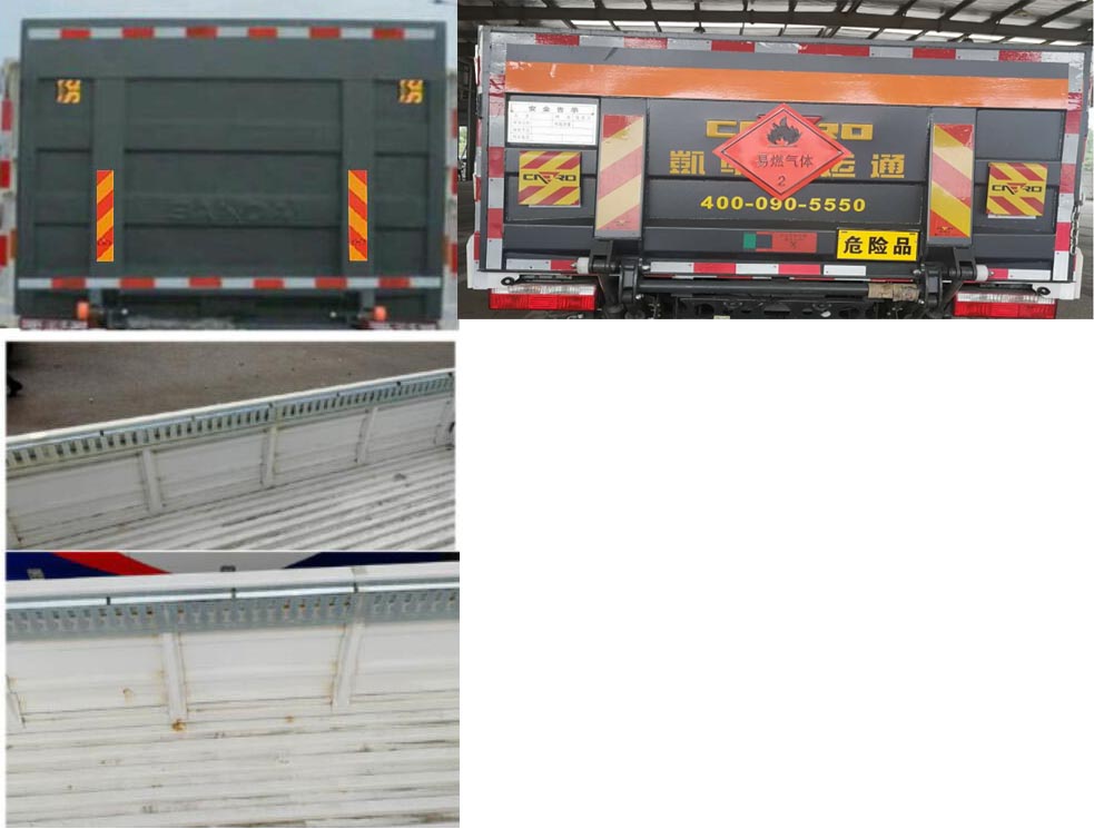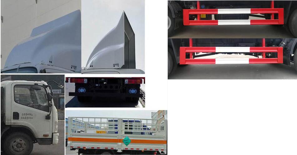 | 备注 | 该车为危险货物运输车.运输介质为易燃气体气瓶和非易燃无毒气体气瓶,类项号为2.1和2.2.仅选用前盘式制动器,前置排气管,子午线轮胎,限速装置的底盘,限速80km/h.安装具有卫星定位功能的行驶记录仪.选装新结构的导流罩,选装不带导流罩.仅选装的单排驾驶室.选装新的侧面结构的驾驶室.选装新结构的后部灯具.选装不同的货箱结构.选装液压尾板.尾板收起状态的水平长度250mm.侧防护及后下部防护装置的材质为R13钢,连接方式为螺栓连接,后部防护离地高度398mm,断面尺寸为100×40mm.油耗值11.5对应发动机4B2-110C55,4B2-95C50,油耗值12.0对应发动机WP2.3Q110E50,WP2.1Q95E50,CA4DC3-12E5-30.ABS防抱死制动系统生产厂家/型号:1.广州瑞立科密汽车电子股份有限公司/CM4XL-4S/4M;2.浙江万安科技股份有限公司/VIE ABS-II.转向轮安装爆胎应急防护装置.尾板质量为340Kg.后防护和液压尾板联动,避免尾板工作时产生干涉. | ||