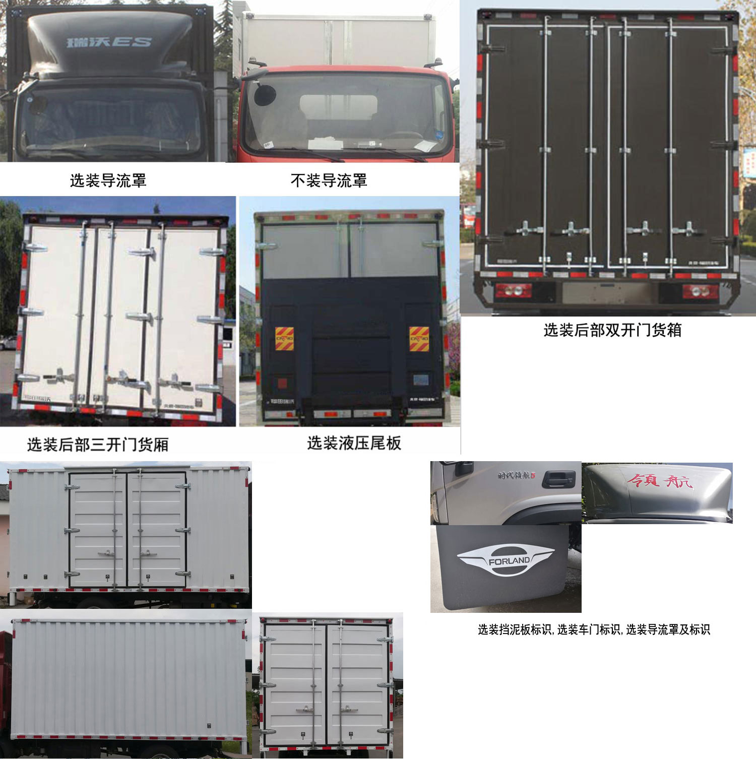 | 备注 | 货厢顶部封闭不可开启;可选装导流罩,可不装导流罩;可选装无侧开门彩涂板货厢,侧单开门彩涂板货厢,侧双开门彩涂板货厢,无侧开门瓦楞板货厢,侧单开门瓦楞板货厢,侧双开门瓦楞板货厢;可选装后部双开门风格,可选装后部三开门风格,选装液压尾板,尾板质量为350Kg,尾板收起状态的水平长度280mm.侧面防护装置材料为冷板B-2.0,后下部防护装置材料为20-D-1-100×50×3,均为螺栓连接,后下防护装置截面尺寸100mm×50mm,后防护离地高度为495mm;ABS系统控制器型号为CM4XL-4S/4M,ABS系统控制器生产企业为广州瑞立科密汽车电子股份有限公司.发动机WP4.1NQ170E61,WP4.1NQ190E61,YCS04200-68对应的油耗值为12.0,11.3,11.4L/100km.选装车身覆盖部件及前部组合灯具.选装新风格前格栅.选装前部logo.选装新前格栅及新logo.选装新款前格栅,选装新款风格保险杠,选装新款前雾灯.选装铝制风格货箱.选装挡泥板标识,选装车门标识,选装导流罩及标识. | ||