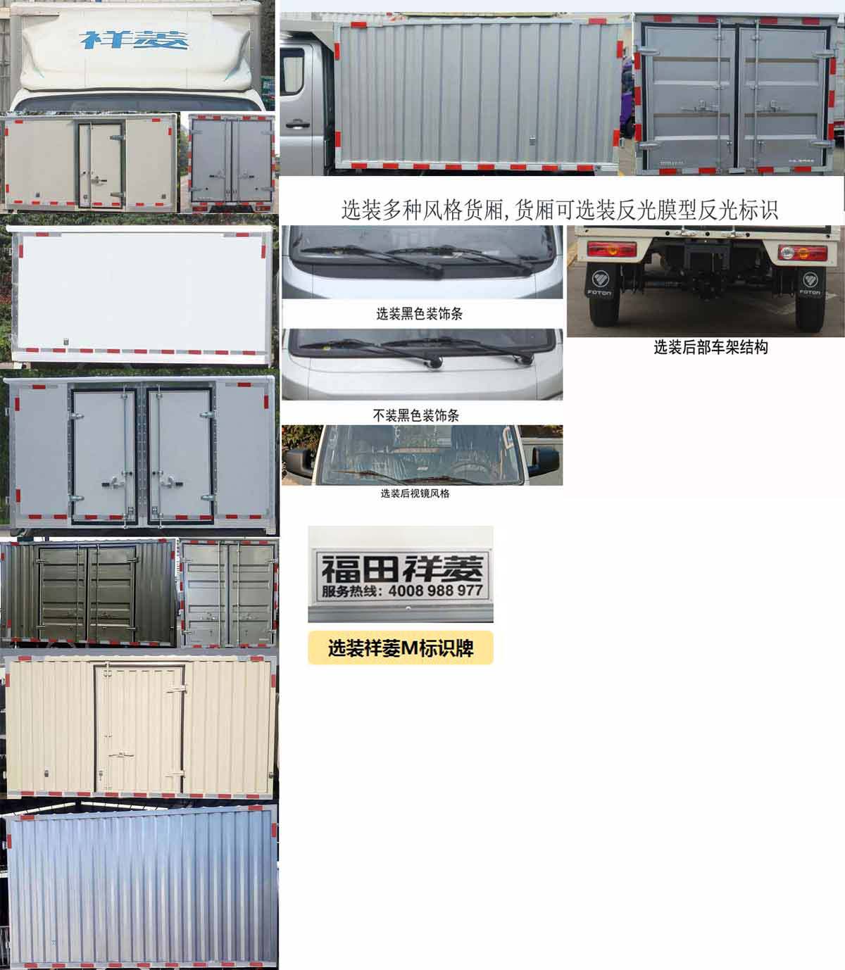 | 备注 | 货厢顶部封闭不可开启,选装带前雾灯带昼间行驶灯造型,选装不带前雾灯及昼间行驶灯造型,选装带导流罩,选装彩涂板单侧开门风格货厢,选装彩涂板不带侧开门风格货厢,选装彩涂板侧双开门风格货厢,选装瓦楞板侧双开门风格货厢,选装瓦楞板单侧开门风格货厢,选装瓦楞板不带侧开门风格货厢,可选装黑色装饰条,可选装不带黑色装饰条,发动机DAM15KR,DAM16KR对应的油耗值分别为7.4L/100km,7.4L/100km,分别对应最高车速100km/h,110km/h.ABS系统控制方式是双参数控制,ABS系统控制器型号是YF9,ABS系统控制器生产企业是武汉元丰汽车电控系统有限公司.选装反光膜型反光标识.选装货厢风格.选装新款后视镜风格.选装高位进气管.可选装后部车架结构.选装货厢风格.选装"福田祥菱"标识牌. | ||