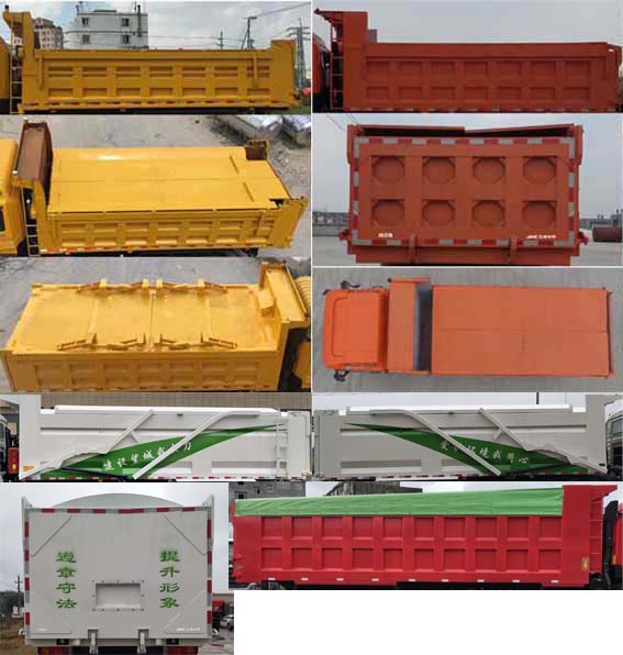 | 备注 | 1.随底盘选装前下视镜,选装三级脚踏板,选装前面罩、前组合灯、前雾灯、前保险杠,选装后视镜;2.侧面及后下部防护装置连接方式为焊接,材料材质为Q235、QSTE650,后防护离地高度为410mm,断面尺寸长×宽为:150mm×75mm;3.安装带卫星定位功能的行驶记录仪;4.发动机WP10.350E53,WP10.310E53,WP12.375E50的油耗申报值(L/100km)分别为44.5,44.5,44.5;5.ABS控制器型号/生产企业:VIE ABS-II/浙江万安科技股份有限公司,CM4XL-4S/4M/广州瑞立科密汽车电子股份有限公司;6.选装多种货箱外观结构,选装环保箱盖、环保篷布软帘,自卸方式为后卸式;7.外形尺寸长/货箱长度/轴距/前悬/后悬尺寸对应关系为:8795/5600/1800+2400+1350/1495/1750,8895/5800/1800+2400+1350/1495/1850,8995/6000/1800+2400+1350/1495/1950;8.选装左侧油箱安装位置,选装不带顶置气喇叭,选装号牌板,选装尿素箱安装位置,选装储气筒安装位置,选装蓄电池安装位置,选装后处理安装位置. | ||