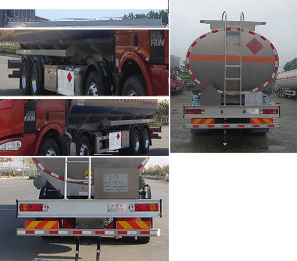 | 备注 | 罐体有效容积:31立方米;罐体外形尺寸:长×长轴×短轴:9000×2495×1855(mm);选装罐体外形尺寸:长×长轴×短轴:9000×2480×1760(mm).危险化学品类项号:3,运输车辆类型:FL;驾驶室准乘人数为2及3人时对应额定载质量分别为20735及20670kg;选装轻型行走机构时,仅选仅准乘2人驾驶室,整备质量10370kg,载质量21500kg.侧防护材质:铝合金,连接方式:螺栓连接,后防护材质:碳钢,连接方式:螺栓连接,后防护断面尺寸:120×60(mm),离地高:480(mm);前轴装配盘式制动器;排气管前置.仅选用底盘子午线轮胎.安装限速装置,限速79km/h;安装具有卫星定位功能的行驶记录仪;ABS系统生产企业:浙江万安科技股份有限公司,型号:VIE ABS-Ⅱ.仅装配CA6DK1-28E5,CA6DK1-32E51发动机对应的油耗值(L/100km)分别为:43.71,39.39,对应的发动机净功率(kW)分别为206,236.随底盘选装平顶驾驶室;选装罐顶护栏,槽型管箱,大告示牌,后牌照板,选装轮胎罩结构型式.选装后爬梯安装位置,后部菱形标志固定板.驾驶室天线的软质部分不计入车辆高度.该车后轴采用空气悬架.该车型可选装ETC车载装置. | ||