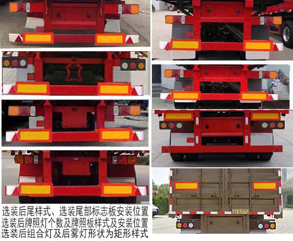 | 备注 | 车厢底板到栅栏顶部的高度为:1800mm,2000mm,2200mm,2400mm,选装后尾样式,选装尾部标志板安装位置,选装后牌照灯个数及牌照板样式及安装位置,选装后组合灯及后雾灯形状为矩形样式,选装长锁杠或短锁杠或隐形锁杠的对开门仓栅结构,可选装两层,三层仓栅,后部选装花栏式后门,三开扇式后门,对开式半封闭后门,对开全封闭样式,后门厢板可为横瓦楞,竖瓦楞,镀锌板,方管十字花后门;整车货厢栏板选装横瓦楞,竖瓦楞,镀锌板,方管十字花样式,选装侧面厢板样式,侧面厢板可选装三开扇,四开扇,五开扇,六开扇,样式为竖瓦楞,立柱可选内插,外插样式,选装圆形立柱结构,选装大梁异型孔结构,选装前部样式,一,ABS型号: SHUNANDA-4S/2M,生产企业: 山东顺安达汽车科技股份有限公司;二,侧、后防护装置均采用Q235B,侧防护装置与车辆采用螺栓连接,后防护装置的断面尺寸为140mm×50mm,离地高度为460mm,与车辆采用焊接;车长/轴距/后悬/牵引销至车辆最前端的距离尺寸(mm)对应关系:10500/5180+1310+1310/1400/1300,11000/5280+1310+1310/1800/1300,11000/5380+1310+1310/1700/1300,11500/5580+1310+1310/2000/1300,11500/5680+1310+1310/2000/1200 | ||