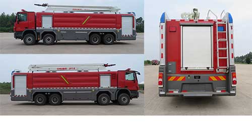 | 备注 | 罐体总容积:19.960立方米,水罐容积:17.980立方米,水罐尺寸:5072×2460×1490mm;泡沫液罐容积:1.980立方米,泡沫液罐尺寸:559×2460×1490mm。整体式侧后防护结构,后防护离地高度:430mm。发动机最大净功率为350kW。ABS型号为ESP8.1,生产企业为BOSCH。该车车身左侧、右侧、后部选装白色卷帘门。主要专用装置有臂架、消防炮。 | ||