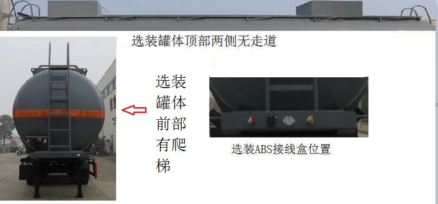 | 备注 | 1.罐体有效容积:29.2立方米, 危险货物运输车辆的类型为;AT型车辆;危险化学品类项号:8;2.罐体外形尺寸(mm)(长×直径)(含封头):10917×1700/2000(前/后)(前端直段长为4004mm(含封头),后段直段长为6913mm(含封头));3.侧面及后下部防护装置的材料均为Q235B,侧后防护装置与车辆均为焊接加螺栓连接,后防护装置断面尺寸为120mm×60mm,后防护装置离地高度为 500 mm,4.选装工具箱样式及位置,选装ABS接线盒位置,选装罐体前部有爬梯,选装罐体顶部无走道,选装挡泥板样式;5. ABS系统的生产厂家为广州瑞立科密汽车电子股份有限公司(型号为CM2XL-4S/2M);6.采用适用于牵引危险品运输半挂车的牵引车. | ||