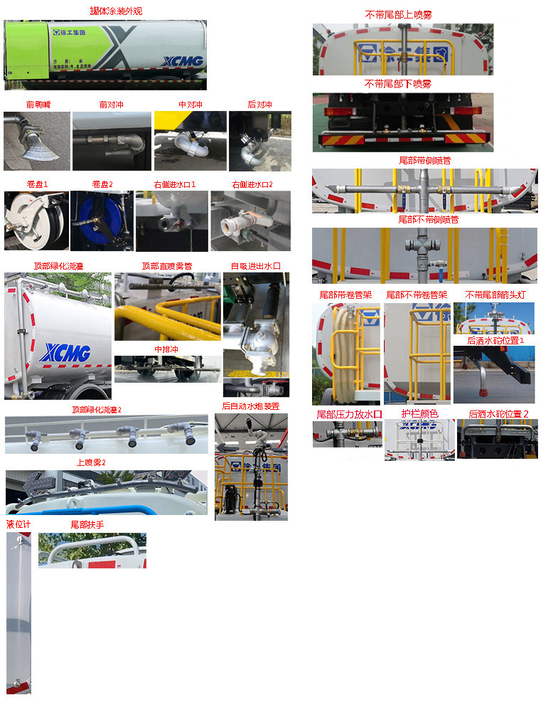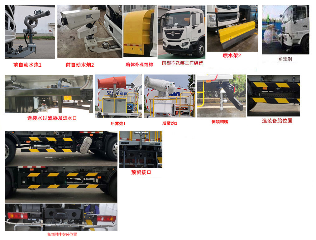 | 备注 | 该车主要专用装置为水罐、水路及作业装置,用于城镇环境清洗及清洁作业,仅选用4500mm、4700mm轴距底盘;罐体有效容积9.8立方米,罐体外形尺寸(长轴×短轴×长度)(mm):2440×1470×3795,装运介质为水,介质密度为1000Kg/m3;选装限速装置,限速89km/h;选装对应说明如下:1、车头选装高压喷水架装置时,外形尺寸长×高(mm):9005×2950,前伸995mm,接近角6°,后悬尺寸1880mm(对应4700mm轴距)2080mm(对应4500mm轴距),离去角11°,整备质量8450kg;2、车头选装前自动水炮装置时,外形尺寸长×高(mm):8610×2950,前伸600mm,接近角12°,后悬尺寸1880mm(对应4700mm轴距)2080mm(对应4500mm轴距),离去角11°,整备质量8100kg;3、选装车头无工作装置形式时,外形尺寸长×高(mm):8010×2950,接近角16°,后悬尺寸1880mm(对应4700mm轴距)2080mm(对应4500mm轴距),离去角11°,整备质量8100kg;4、车后选装后雾炮(配加宽工作平台)车头无选装时,外形尺寸长×高(mm):8435×3060,接近角9°,后悬尺寸2305mm(对应4700mm轴距)2505mm(对应4500mm轴距),离去角9°,整备质量8450kg;5、车头选装前滚刷装置时,外形尺寸长×高(mm):8975×2950,前伸965mm,接近角6°,后悬尺寸1880mm(对应4700mm轴距)2080mm(对应4500mm轴距),离去角11°,整备质量8450kg;随底盘选装驾驶室,选装罐体涂装外观、鸭嘴、对冲、卷盘、右侧进水口、顶部绿化浇灌、直喷雾管、中排冲、自吸进出水口、后自动水炮装置、不带尾部上下喷雾、侧喷管、卷管架、不带尾部箭头灯、后洒水砣位置、尾部压力放水口、护栏颜色、液位计、尾部扶手、箱体外观结构、选装水过滤器及进水口、侧喷鸭嘴、备胎位置、预留接口;选装底盘附件安装位置;侧面防护装置材质为Q235B,连接方式为螺栓连接;后防护装置材质为Q235B,连接方式为焊接;后部防护装置的断面尺寸为180×60mm,离地高度为400mm;随底盘装ABS.ABS型号/生产厂家:3631010-C2000/东科克诺尔商用车制动系统(十堰)有限公司,ABS 8/东科克诺尔商用车制动系统(十堰)有限公司, 4460046450/威伯科汽车控制系统(中国)有限公司.随底盘装行驶记录仪. | ||