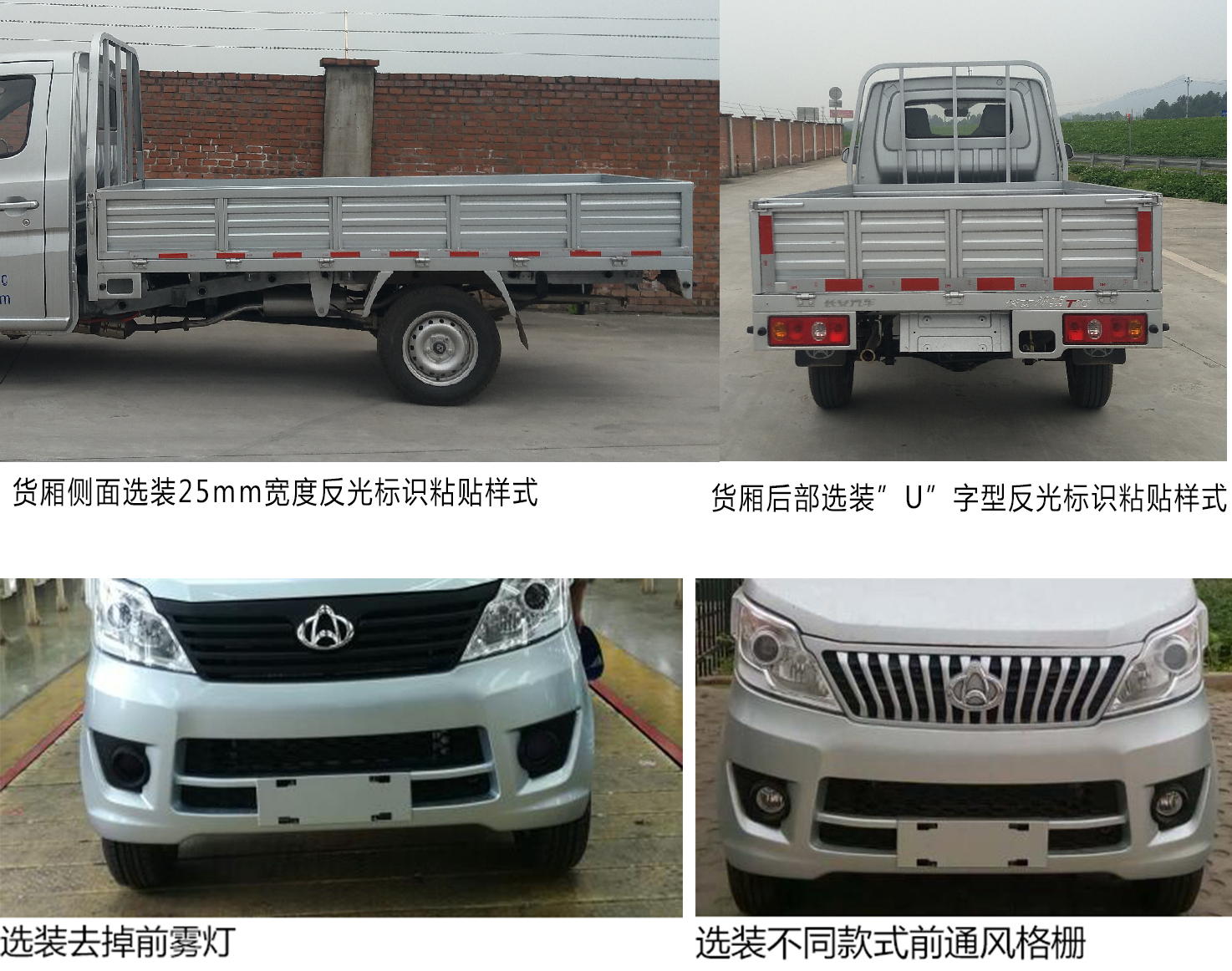 | 备注 | 根据货厢结构,货厢侧面选装25mm宽度反光标识粘贴样式;货厢后部选装"U"字型反光标识粘贴样式;选装不同款式前通风格栅,选装去掉前雾灯;发动机净功率80kW;DAM15KR型号发动机对应的油耗值为7.1L/100km;ABS型号:WX80,生产企业:浙江万向精工有限公司。 | ||
