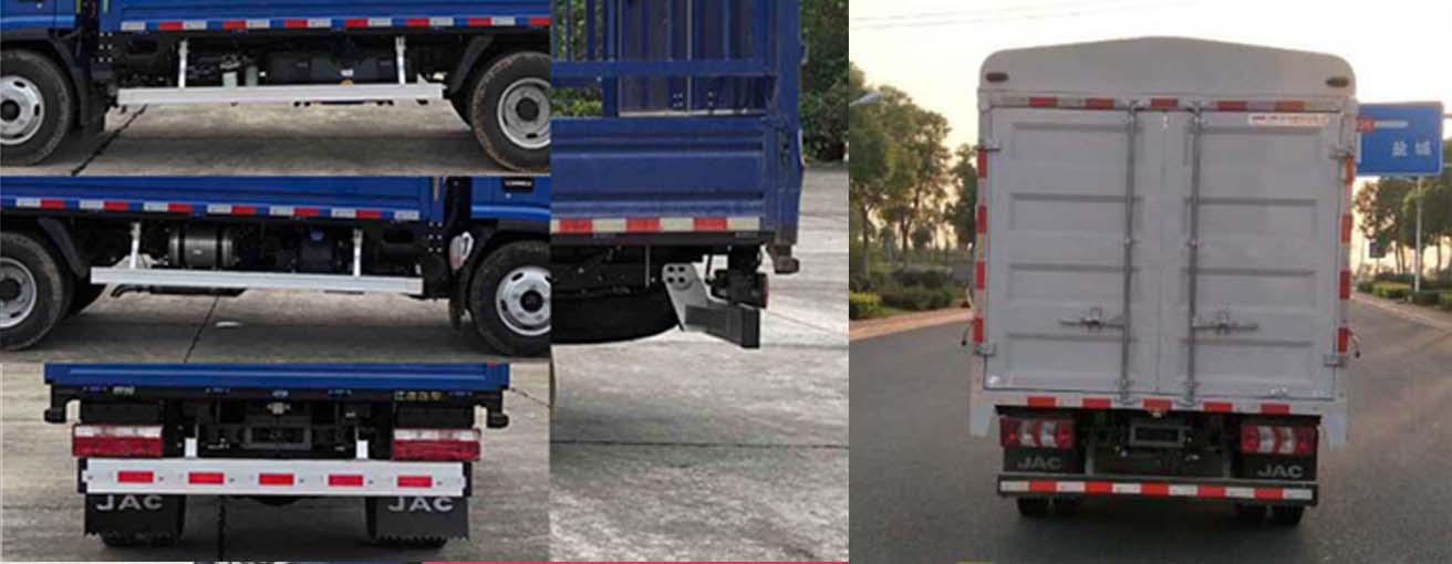 | 备注 | 1.货箱底板到仓栅顶部高度为2000mm,2200mm,1730mm,1850mm,1450mm;2.发动机D20TCIF1,HFC4DB3-2E,P2.3NQ130E61,HFC4DE2-2E,HFC4DE2-2E2,HFC4DB3-2E3对应的油耗值:11.4,11.4,11.4,11.4,11.4,11.3L/100km;3.ABS型号/厂家为VIE ABS-Ⅱ/浙江万安科技股份有限公司,ABS 8克诺尔商用车系统企业管理(上海)有限公司;4.侧面及后下部防护装置材料为Q235,连接方式为螺栓连接,后部防护装置断面尺寸(长×宽):120mm×60mm,离地高度为440mm,选装侧后防护,侧面及后下部防护装置材料为Al-6061,连接方式为螺栓连接,选装的后部防护装置断面尺寸(长×宽):150mm×55mm离地高度为430mm;5.选装不带导流罩;6.选装货厢及后部风格;7.选装货箱系固装置;8.选装后部灯具;9.选装单排驾驶室;选装不同样式的进气格栅,选装铝合金轮毂;选装不同样式和材质的货箱;10.选装铝合金轮辋 | ||