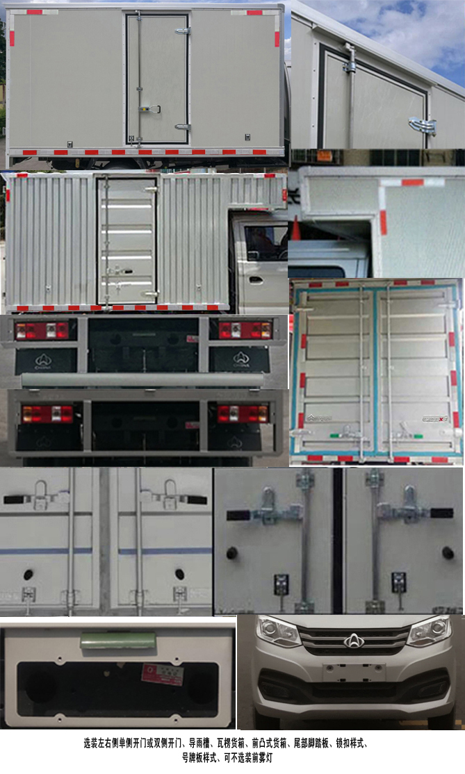 | 备注 | 1.选装部件:左右侧单侧开门或双侧开门,导雨槽,导流罩,瓦楞货厢(瓦楞货箱时货箱内部宽度为1600mm),前凸式货厢,尾部脚踏板,锁扣样式,号牌板样式,空调,电动门窗,中控锁,MP5,倒车可视,可不选装前雾灯.2.车厢顶部封闭,不可开启.3.ABS控制系统型号/生产企业/控制方式:YF8/武汉元丰汽车电控系统有限公司/四通道式.4.LJ469Q-AEB发动机对应油耗值为7.5L/100km,最大净功率为62kW. | ||