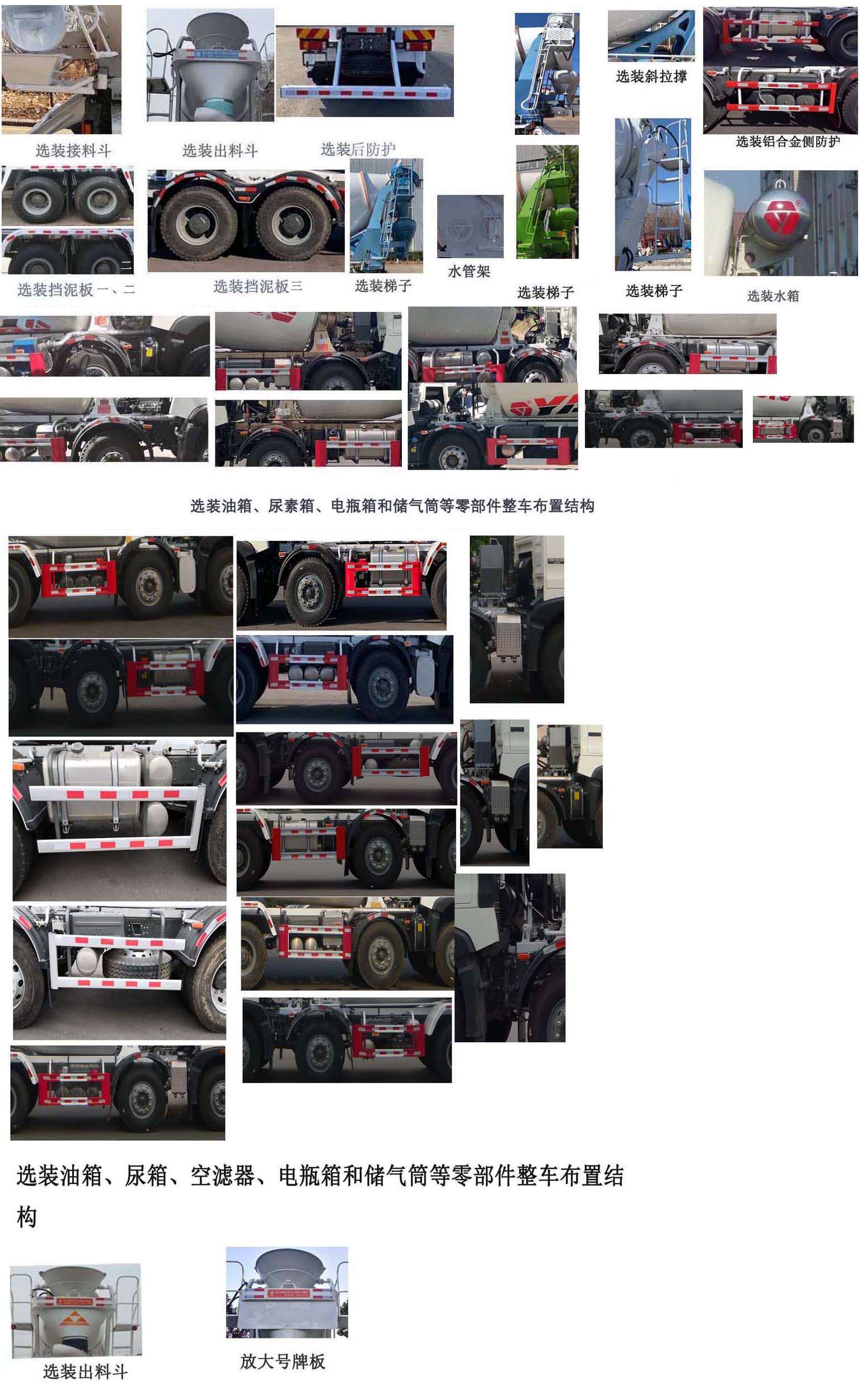| 备注 | 搅动容量7.6立方米.罐体总长6015mm,最大直径2150mm.罐体安装角度12°.侧后防护材质:Q235,选装侧防护材质铝合金5052,侧防护和选装侧防护支撑座与副车架焊接,侧防护与支撑座螺栓连接,后防护和选装后防护与车架螺栓联接,后防护断面尺寸: 120mm×80mm,后防护离地高度:490mm.安装具有卫星定位功能的行驶记录仪.ABS系统型号为4460046300,生产企业为威伯科汽车控制系统(中国)有限公司.发动机MC07.31-50和发动机MC07.34-50及发动机MC07.35-50油耗值37.2L/100km,发动机WP8.340E51油耗值37.3L/100km,发动机MC09.40-50和MC09.38-50及MC09.36-50和MC09.34-50油耗值37.3L/100km,发动机MC07H.35-50和MC07H.32-50及MC07H.29-50油耗值37.4L/100km.发动机MC11.44-50和MC11.40-50油耗值37.4L/100km,发动机WP10H400E50油耗值37.4L/100km,发动机WP9H350E50油耗值37.3L/100km,发动机WP8.320E51A油耗值37.3L/100km,随底盘选装驾驶室,选装后风窗,选装遮阳罩,选装保险杠等.随底盘选装油箱、尿素箱、空滤器、电瓶箱和储气筒等零部件整车布置结构;仅选用底盘轴距(mm)1800+3025+1400,1800+3050+1350;仅选用钢板弹簧悬架.选装挡泥板、接料斗、出料斗、选装梯子、斜拉撑、水管架、侧后防护、水箱、放大号牌板等 | ||