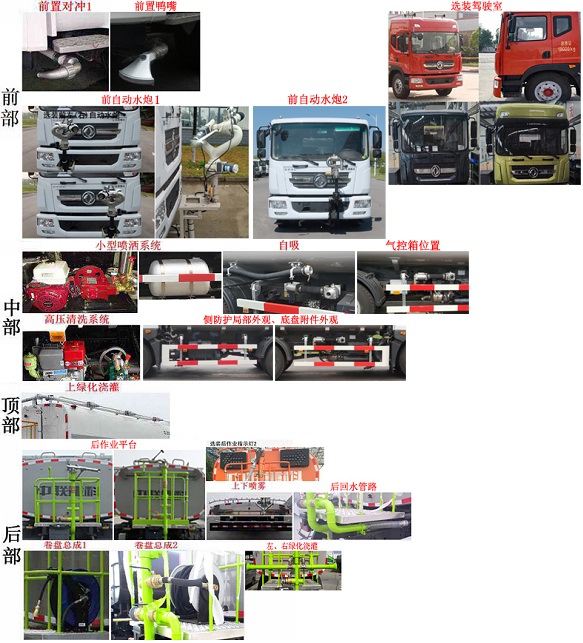 | 备注 | 该车选用3950mm底盘轴距;该车装有水罐、水路系统、清洗工作装置、作业平台、控制系统,用于清洗作业;罐体外形尺寸(长轴×短轴×长度)(mm):2390×1410×4200;罐体有效容积9.72立方米;选装前自动水炮1时,前伸935mm,整车长8280mm;选装前自动水炮2时,前伸750mm,整车长8095mm;侧面防护装置材料为Q235A,连接方式为螺栓连接,可选装其局部外观,后防护装置材料为Q345A,与车辆连接方式为螺栓连接;后部防护装置的断面尺寸为240×65mm,离地高度为450mm;该车可选装对冲,鸭嘴,前自动水炮,小型喷洒系统,自吸,高压清洗系统,底盘附件外观,气控箱位置,上绿化浇灌,后作业平台,后作业指示灯,上下喷雾,卷盘,左右绿化浇灌,后回水管路;该系列选装对于整车尺寸,重量变化可忽略不计;随底盘选装驾驶室外观,随底盘装有ABS,ABS系统生产厂家,型号:焦作博瑞克控制技术有限公司,J ABS. | ||