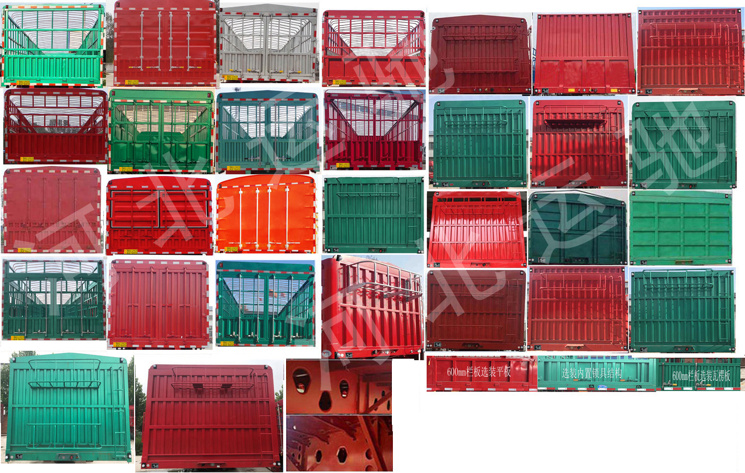 | 备注 | 车厢底板至仓栅顶部的高度及对应外形总高度为:2600mm(3950mm,3900mm),2400mm(3750mm,3700mm),2200mm(3550mm,3500mm),2000mm(3350mm,3300mm),1800mm(3150mm,3100mm);选装大梁异形孔,选装后部灯具样式.选装前部样式,选装内置锁具结构,选装后门样式(对开式半封闭后门,对开全封闭样式为横瓦楞,竖瓦楞后门)及侧面花栏结构(二层仓栅,三层仓栅,对开门锁杆,对开门半截锁杆,隐藏锁杆).选装圆弧形前立柱,选装尾部标志板安装位置,选装号牌板样式,车长/牵引销至车辆最前端的距离/轴距/后悬尺寸对应关系(mm):13000/1300/6680+1310+1310/2400,13000/1200/6780+1310+1310/2400,12500/1300/6480+1310+1310/2100,12500/1200/6580+1310+1310/2100,12000/1300/6280+1310+1310/1800;ABS:型号:HNABS-4S/2M;生产厂家:山东海纳汽车科技有限公司.防护材料均采用Q235B,与车身的连接方式为焊接,后下部防护装置的断面尺寸(mm):140×55,离地高度440mm. | ||