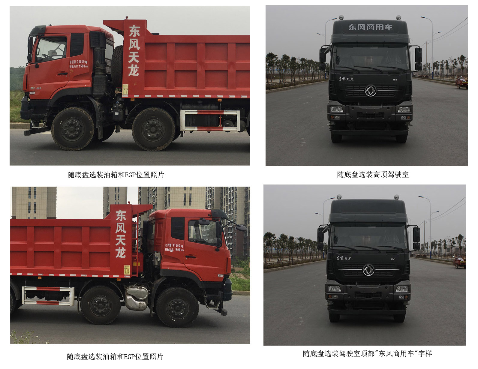 | 备注 | 1、货厢倾卸方式为后卸式。2、防护装置所用的材料材质:Q235,防护装置连接方式:螺栓连接,后部防护装置的断面尺寸(长×宽)mm:120×60,离地高度:480mm、460mm、440mm 。3、随底盘选装同系列高顶驾驶室,随底盘选装驾驶室顶部"东风商用车"字样,选装箱体侧板结构,选装货箱后部结构,随底盘选装油箱和EGP位置照片。4、该车装备有具有卫星定位功能的行驶记录仪。5、ABS生产厂家:东科克诺尔商用车制动系统(十堰)有限公司;型号:3631010-C2000。6、仅选用2050+3200+1350mm轴距。7、DDi11E385-60发动机对应的油耗值为40.0L/100km,DDi11E430-60发动机对应的油耗值为40.0L/100km,DDi11E465-60发动机对应的油耗值为40.0L/100km。 | ||
