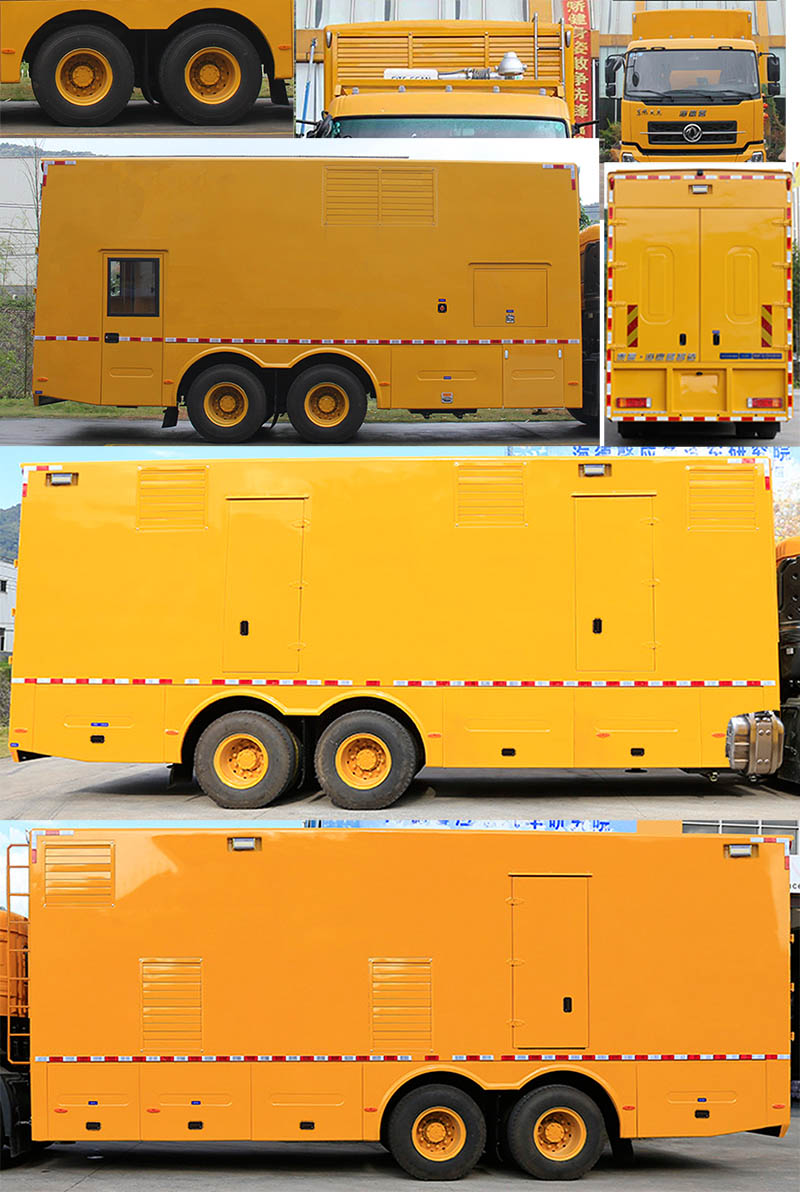 | 备注 | 1,专用装置:发电机组,主要用于抢险救灾以及重大政治会议、赛事活动等的应急电力支援;2,随底盘选装最高车速98(km/h);选装前面罩、前保险杠及前部灯具、驾驶室顶部装饰灯、前雾灯、前围扰流板、卧铺侧窗装饰板;选装不同大小、格数数量及位置的工作门、上翻门、玻璃窗、百叶窗;选装顶部升降照明灯;选装裙板式侧防护;选装无凸起轮罩;选装爬梯样式;3,左、右侧防护均为横杆结构,与车架为螺栓连接,材料为Q235-A,断面尺寸120×40(mm),下边缘离地高度490mm;后防护由箱体代替,材料为热轧钢板Q235-A,后防护下边缘离地高490mm;选装裙板式侧防护时,侧防护由箱体代替,材料为热轧钢板Q235-A;4,ABS型号/生产厂家:3631010-C2000/东科克诺尔商用车制动系统(十堰)有限公司;ABS 8/东科克诺尔商用车制动系统(十堰)有限公司;4460046450/威伯科汽车控制系统(中国)有限公司;5,车长/轴距/前悬对应关系为:9990/4350+1350/1480;10990/5350+1350/1480;10010/4350+1350/1500;11010/5350+1350/1500;6,高度变化由选装不同品牌及型号的发电机组引起;7,选装无凸起轮罩时整车宽度为2500mm;8,当选装720kW发电机组时,总质量为24495kg,当选装700kW发电机组时,总质量为24000kg,当选装670kW发电机组时,总质量为23505kg,当选装600kW发电机组时,总质量为22505kg,当选装550kW发电机组时,总质量为21505kg。 | ||