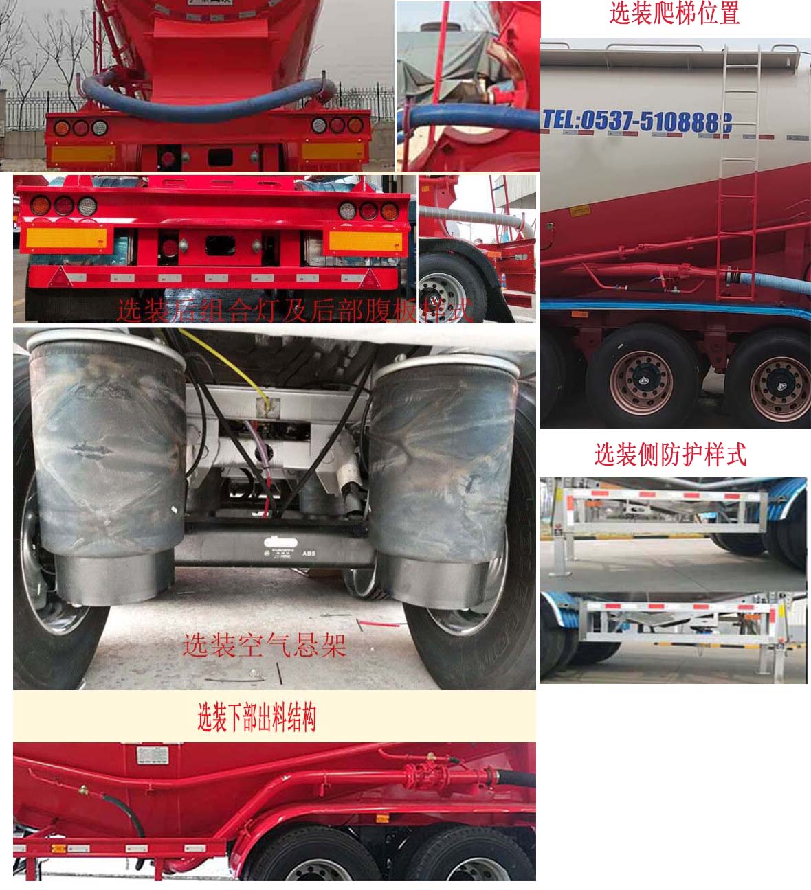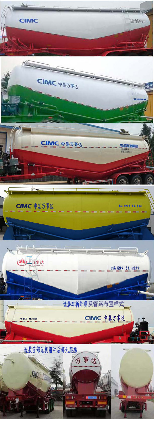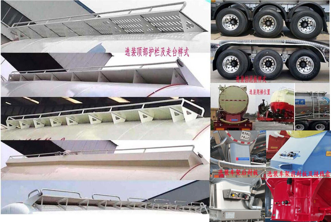 | 备注 | 该车罐体有效容积为42立方米,罐体外形尺寸(长度*宽度*高度)mm:9420(含封头)*2500*3195,两端封头直径均为φ2108mm,最大截面高度3195mm,运输介质:粉煤灰;机组可以选装,不带机组对应外形尺寸为:9900mm×2550mm*4000mm,不带机组时安装重型行走机构及附件时对应的整备质量为8000kg,安装轻型行走机构及附件是对应整备质量为7600kg.ABS系统厂家为广州市西合汽车电子装备有限公司,广州瑞立科密汽车电子股份有限公司,广州瑞立科密汽车电子股份有限公司,威伯科汽车制动系统(中国)有限公司,型号分别为:XH-GQ4S2M-E01,CM6XL-6S/6M,CM2XL-4S/2M,400500×××0;侧防护栏材料为Q235B或铝合,与车架连接方式均为螺栓连接,后防护材质为Q235B,与车架的连接方式为螺栓连接,后防护栏断面尺寸(mm)为140×50mm,离地高度为500mm.顶部封闭不可开槽,后部不可开启,选装空气悬架,选装盘式制动器,选装下部出料结构,选装顶部护栏及走台样式.选装挡泥板样式及爬梯位置,选装车架前后封板及前部接线盒样式,选装后部腹板样式,选装后尾灯具样式.选装车辆外观及管路布置样式样式;车辆长度(mm)/牵引销到车辆最前端距离(mm)/轴距(mm)/后 悬(mm)/牵引销中心轴线到半挂车最后端水平距离(mm)的对应关系为:10600/1520/5340+1310+1310/1120/9080,10600/1520/5200+1310+1310/1260/9080,10600/1160/5700+1310+1310/1120/9440,9900/820/5340+1310+1310/1120/9080,9900/820/5200+1310+1310/1260/9080,9900/460/5700+1310+1310/1120/9440; | ||