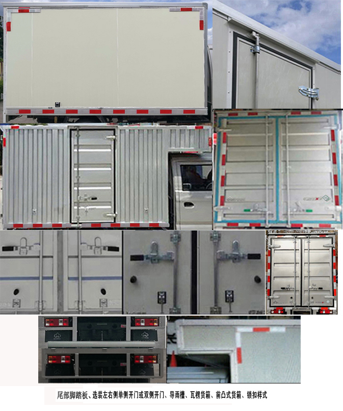 | 备注 | 1.选装部件:左右侧单侧开门或双侧开门,导雨槽,导流罩,瓦楞货厢(瓦楞货箱时货箱内部宽度为1600mm),前凸式货厢,锁扣样式,号牌板样式,MP5,倒车可视,电动门窗,中控锁,空调,尾部脚踏板,可不选装前雾灯.2.车厢顶部封闭,不可开启.3.尺寸对应关系整车长/货厢长/后悬:5455/2535/1330,5615/2695/1490.4.ABS控制系统型号/生产企业/控制方式:YF8/武汉元丰汽车电控系统有限公司/四通道式. 5.LJ469Q-AEB发动机对应油耗值为7.9L/100km,最大净功率为62kW. | ||