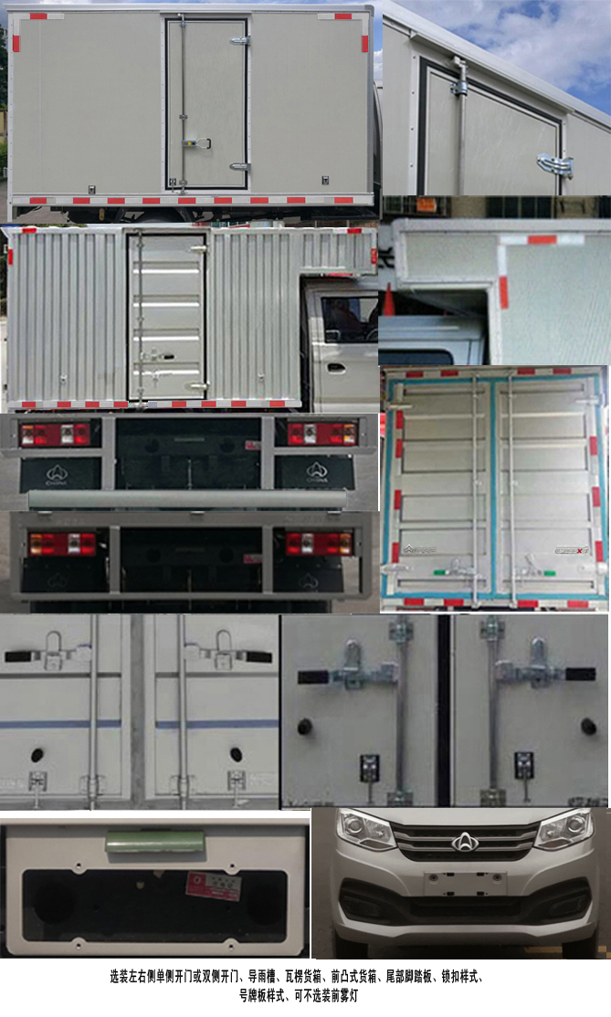 | 备注 | 1.选装部件:左右侧单侧开门或双侧开门,导雨槽,导流罩,轮辋样式,瓦楞货厢(瓦楞货箱时货箱内部宽度为1550mm),前凸式货厢,尾部脚踏板,锁扣样式,号牌板样式,空调,电动门窗,中控锁,MP5,倒车可视,可不选装前雾灯.2.车厢顶部封闭,不可开启.3.ABS控制系统型号/生产企业/控制方式:YF8/武汉元丰汽车电控系统有限公司/四通道式.4.LJ469Q-AEB发动机对应油耗值为7.1L/100km,最大净功率为62kW. | ||