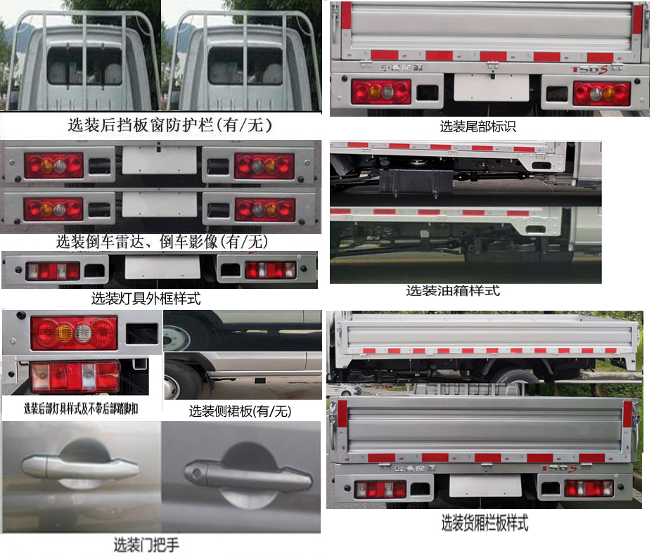 | 备注 | 选装(后挡板窗防护栏,倒车雷达,倒车影像,MP5,后部灯具样式,不带后部踏脚扣,货厢栏板样式,门把手样式,尾灯外框样式,尾部字标,侧裙板,油箱样式).SWC15M发动机净功率72KW,油耗申报值7.1L/100km.ABS型号/生产企业:YF8/武汉元丰汽车电控系统有限公司.该车型符合国六标准B阶段限值要求. | ||