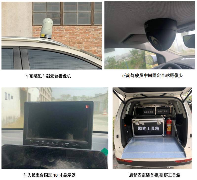 | 备注 | 该车主要用于现场勘查和取证使用;车载云台摄像机安装于车外顶部;车头仪表台固定安装10寸显示器;车内顶部前端正副驾驶员座位之间安装半球摄像头;配置装备柜和勘察工具箱,固定于车内后部;发动机型号:LJ0,发动机最大净功率104kW;ABS型号:ESP9,ABS生产厂家:博世汽车配件(成都)有限公司,博世汽车配件(苏州)有限公司。 | ||