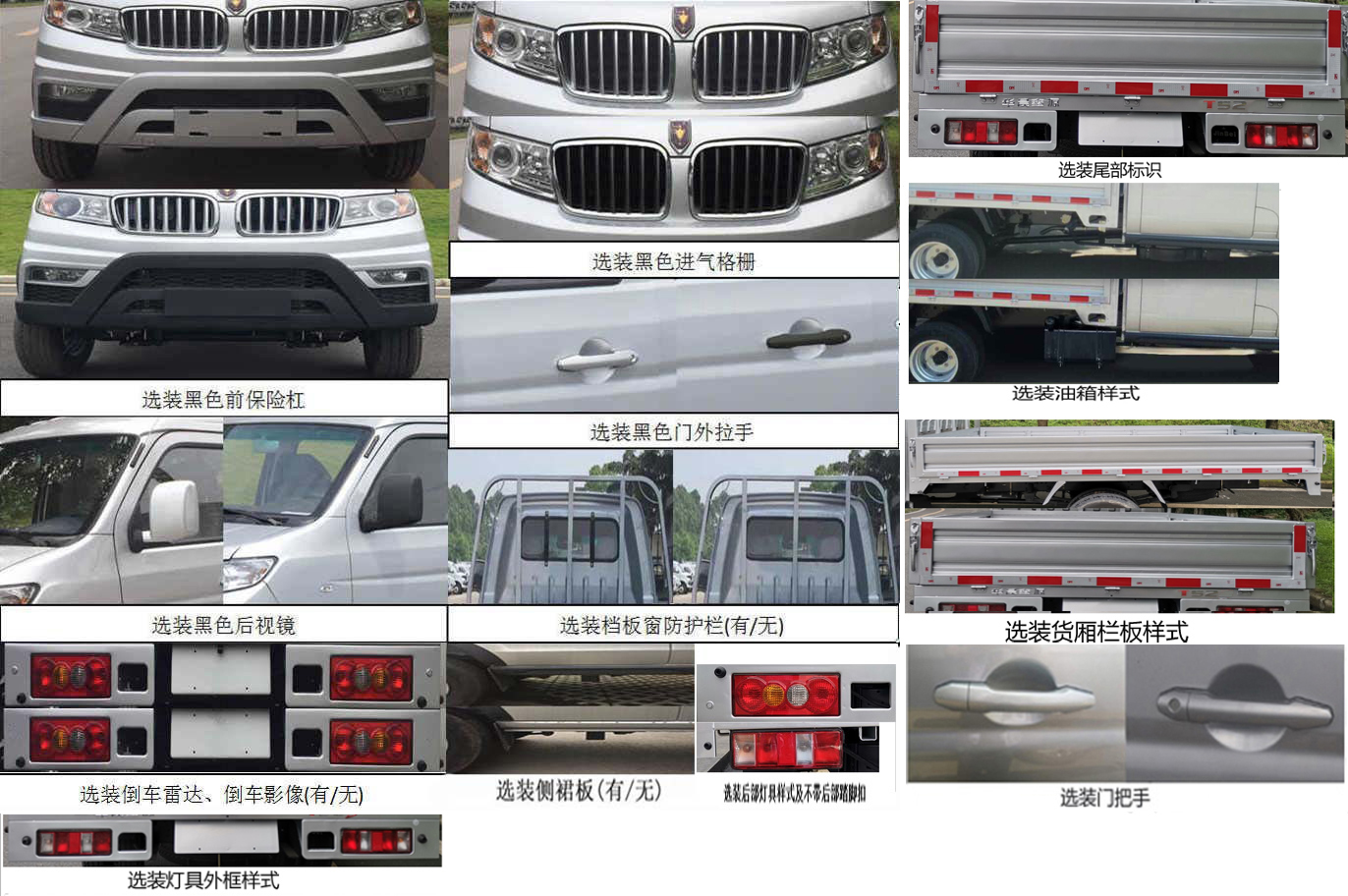 | 备注 | 选装(MP5,黑色前保险杠/门外拉手/后视镜/进气格栅,档板窗防护栏,倒车雷达,倒车影像,侧裙板,后部灯具样式,不带后部踏脚扣,货厢栏板样式,门把手样式,尾灯外框样式,尾部字标,油箱样式).SWC15M发动机净功率72KW,油耗申报值7.5L/100km.ABS型号/生产企业:YF8/武汉元丰汽车电控系统有限公司.该车型符合国六标准B阶段限值要求. | ||