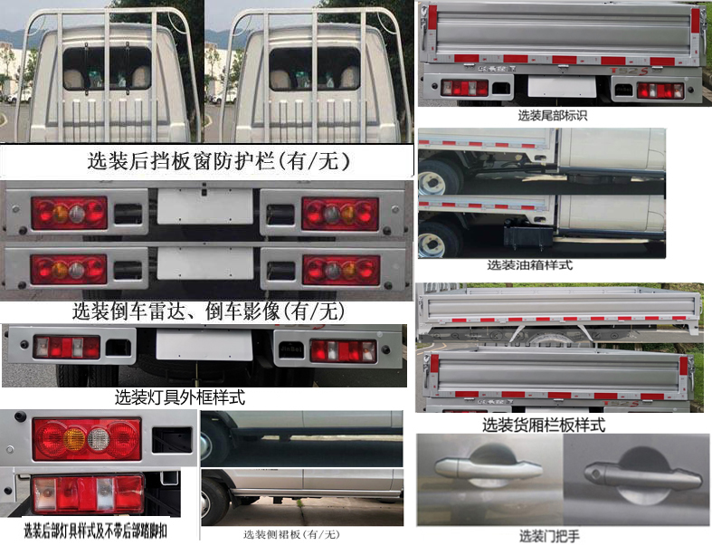 | 备注 | 选装(后挡板窗防护栏,倒车雷达,倒车影像,MP5,后部灯具样式,不带后部踏脚扣,货厢栏板样式,门把手样式,尾灯外框样式,尾部字标,侧裙板,油箱样式).SWC15M发动机净功率72KW,油耗申报值7.9L/100km.ABS型号/生产企业:YF8/武汉元丰汽车电控系统有限公司.该车型符合国六标准B阶段限值要求. | ||