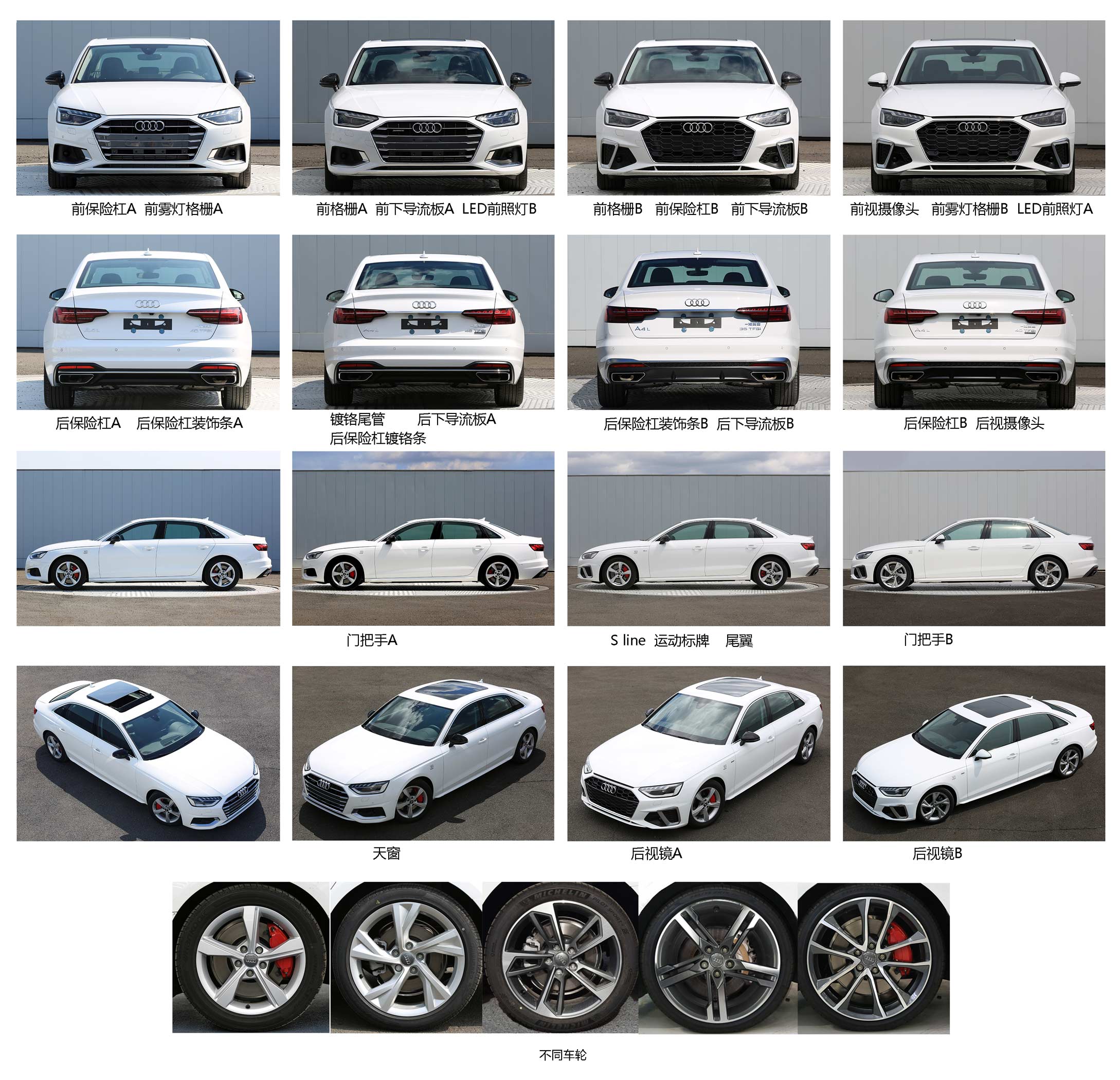 | 备注 | 选装:前保险杠A。前雾灯格栅A。前格栅A。前下导流板A。LED前照灯B。前格栅B。前保险杠B。前下导流板B。前视摄像头。前雾灯格栅B。LED前照灯A。后保险杠A。后保险杠装饰条A。镀铬尾管。后下导流板A。后保险杠镀铬条。后保险杠装饰条B。后下导流板B。后保险杠B。后视摄像头。门把手A。S line运动标牌。尾翼。门把手B。天窗。后视镜A。后视镜B。不同车轮。ABS系统生产厂家是:Robert Bosch GmbH,博世汽车部件(苏州)有限公司,型号是ESP9。发动机最大净功率是140kW。因为选装不同保险杠产生2种长度。因选装不同底盘导致两种高度。 | ||