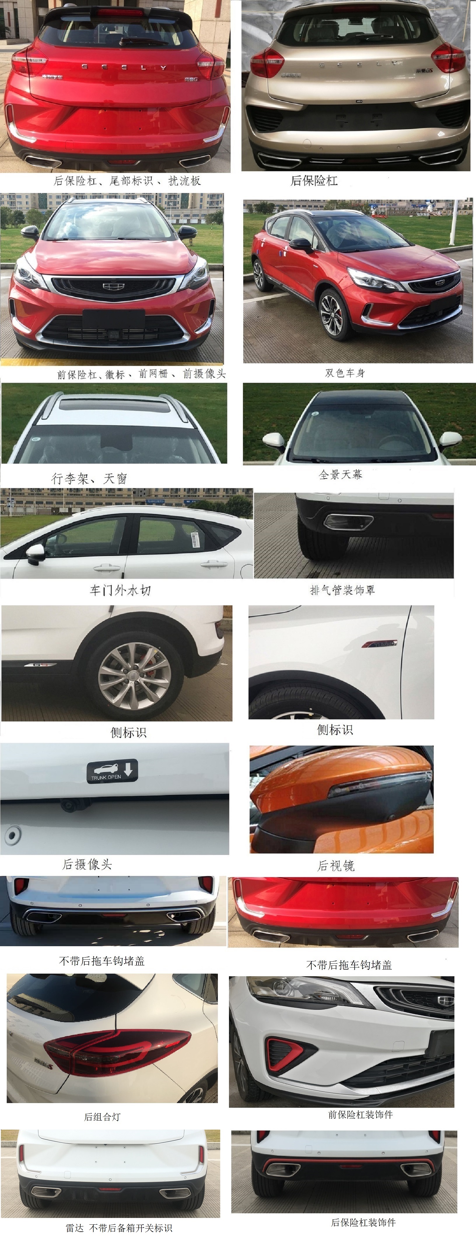 | 备注 | 该车选装全景天幕,天窗,行李架,前后保险杠,前保险杠装饰件,后保险杠装饰件,尾部标识,前网栅,徽标,双色车身,侧标识,扰流板,后摄像头,后视镜,后组合灯,雷达,前摄像头,轮辋,车门外水切,排气管装饰罩,车轮装饰罩,不带后拖车钩堵盖,不带后备箱开关标识.该车装配ABS防抱死系统,生产企业为博世汽车部件(苏州)有限公司,产品型号为ESP9.3.该车型发动机最大净功率为130kW. | ||