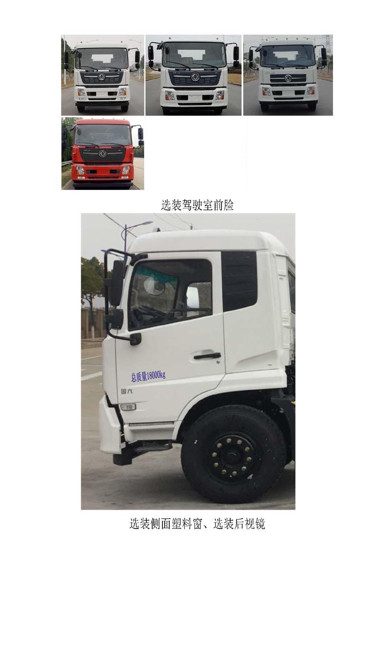 | 备注 | 1.选装高度不同的驾驶室;选装前雾灯;选装驾驶室顶部装饰灯;选装驾驶室前面罩;选装前保险杠及前部灯具,选装后视镜;选装后部灯具;驾驶室卧铺侧窗选装装饰板;ABS型号/生产厂家:3631010-C2000/东科克诺尔商用车制动系统(十堰)有限公司,ABS 8/东科克诺尔商用车制动系统(十堰)有限公司, 4460046450/威伯科汽车控制系统(中国)有限公司;2.选轴距4500mm的底盘;3.可配圆形厢体或方形厢体,后部可选装摆臂,提斗,提桶机构,可选装后部灯具;配圆形厢体参数对应关系(总长/前悬/后悬/总高/整备质量/额定载质量):不选装时8265(8295)/1400(1430)/2365/3040/10200/7605(3人),7670(2人),选装提斗时8570(8600)/1400(1430)/2670/ 3040/10750/7055(3人),7120(2人), 选装提桶时8570(8600)/1400(1430)/2670/3040/10300/7505(3人),7570(2人),配方形厢体参数对应关系(总长/前悬/后悬/总高/整备质量/额定载质量):不选装时8270(8300)/1400(1430)/2370/3120/10920/6885(3人),6950(2人);选装摆臂时8380(8410)/1400(1430)/2480/3120/11200/6605(3人),6670(2人);选装提斗时8460(8490)/1400(1430)/2560/3120/11200/6605(3人),6670(2人);4.侧面防护装置材质:Q235,与底盘大梁连接方式:螺栓连接;5.后下部防护装置材质:Q235,后下部防护装置截面尺寸:160×80×8mm,离地高度:415mm,连接方式:焊接;7.应安装具有卫星定位功能的行驶记录仪;8.发动机/最大净功率(kw)/油耗(L/100km)对应关系:D6.7NS6B230/166/23.7,B6.2NS6B210/151/23.8,B6.2NS6B230/166/23.8,DDi50E190-60/143/23.9,D4.5NS6B190/135/24.4;9.顶部封闭,不可开启.10.该车为垃圾收集转运专用车辆,专用装置由压缩式垃圾厢,上料机构及液压控制装置组成;11.该车型可选装ETC 车载装置。 | ||