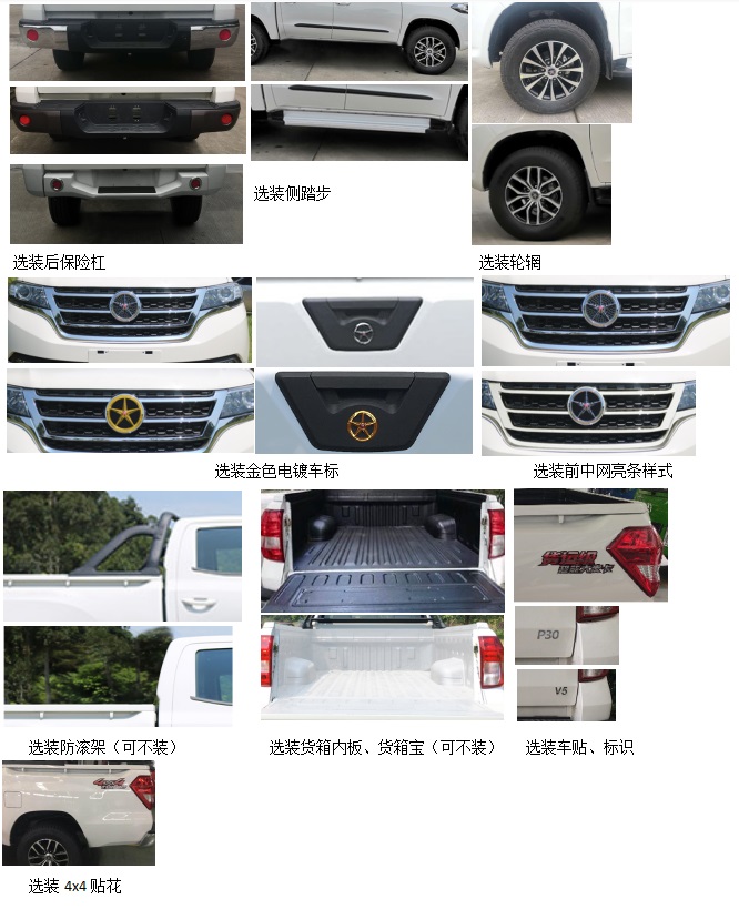 | 备注 | 选装后保险杠,侧踏步,轮辋,金色电镀车标,中网亮条样式,防滚架(可不装),货箱内板、货箱宝(可不装),车贴、标识,4X4贴花。带OBD;ABS型号/厂家:WX80/浙江万向精工有限公司。当选装货箱内板时,货箱内部最大尺寸为1575mm×1610mm×530mm;选装后保险杠时整车长为5219mm,前悬/后悬为905mm/1214mm. | ||