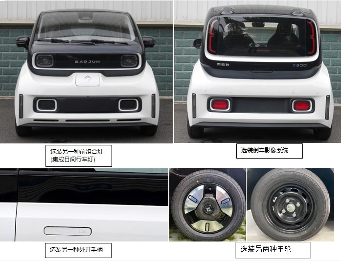 | 备注 | 该产品为新能源车辆,新能源类型为纯电动。选装:第二排单人座椅,倒车影像系统;选装另一种外开手柄、前组合灯(集成日间行车灯);选装另两种车轮;选装另三种外观。ABS型号:ABS9, ESP9,生产企业:博世汽车部件(成都)有限公司,博世汽车部件(苏州)有限公司。电动汽车储能装置种类:磷酸铁锂蓄电池,储能装置生产企业:河南省鹏辉电源有限公司,动力电池系统额定电压:112V,动力电池系统额定容量:150Ah;驱动电机峰值功率:29kW。两座对应总质量1050kg,整备质量885kg、900kg;三座对应总质量1155kg,整备质量905kg、930kg。 | ||