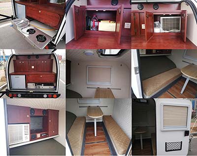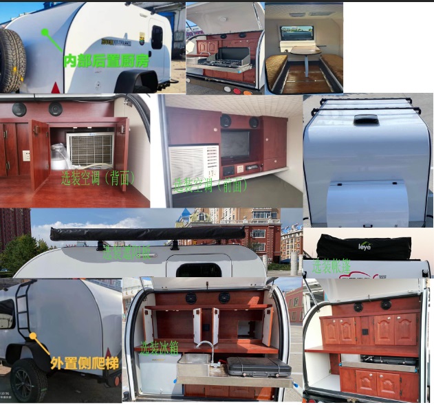 | 备注 | 厢体内部设有床、桌椅、炊具等旅居专用设施.牵引杆深入量40mm.连接器最大负荷100kg.车厢顶部封闭,不可开启;该车非乘用车,行驶过程中不载人.爬梯选装;可选装不带帐篷,不带帐篷时车辆高度为1960mm. 内部后置厨房,选装空调,选装冰箱,选装遮阳板,选装帐篷,外置侧爬梯. | ||