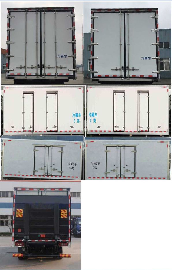 | 备注 | 1.货厢顶部封闭,不可开启;2.可选装单排驾驶室型式,可选装同等功率制冷机组,可选装导流罩,可选装左/右两侧单/双侧开门,选装无侧开门货厢风格,选装后部三开门;3.侧面防护装置材料为冷板B-2.0,后下部防护装置材料为610L,后部防护装置截面尺寸120mm×70mm,均为螺栓连接.后下防护装置离地高度485mm,选装液压尾板时,后防护材质为圆管Q345A,为螺栓连接,后部防护装置截面尺寸直径为120mm,离地高度485mm;4.ABS系统型号:ABS-E,生产企业:威伯科汽车控制系统(中国)有限公司;ABS系统型号:ABS-VI.E,生产企业:广州瑞立科密汽车电子股份有限公司;5.发动机F3.8NS6B170,D40TCIF1,WP4.1NQ170E61,YCS04200-68,F3.8NS6B156,D40TCIF2对应的油耗值分别为19.7,19.6,19.8,19.8,19.8,19.6;选装液压尾板,液压尾板质量450kg,收起时水平长度为300mm;选装左右两侧对开门,选装左右两侧两个单开门,选装货箱内部挂钩及导轨结构;选装货箱后部双/四锁杆风格,选装货箱后部五对固定折页风格;选装同等功率制冷机组.选装储气筒内置; | ||