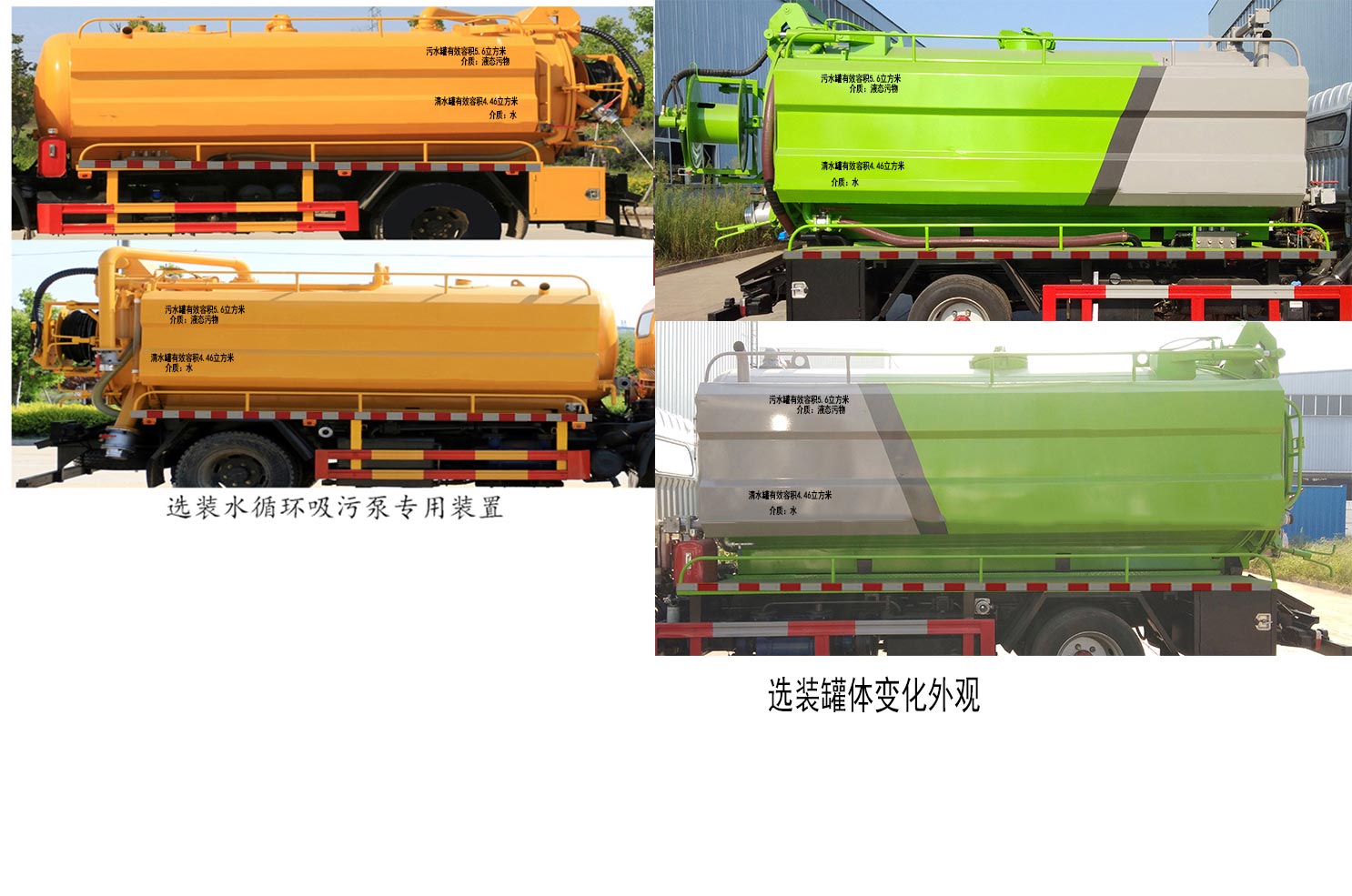 | 备注 | 1.随底盘选装驾驶室,随底盘轮距选择整车宽度,随底盘选装附件不同的安装位置,选择侧面车身样式及选装水循环泵;2.ABS型号:ABS/ASR-24V-4S/4M,厂家:襄阳东风隆诚机械有限责任公司;3.此车型仅采用轴距:3800mm;4.侧/后防护材料Q235B,侧防护螺栓连接,后防护焊接连接,后防护断面尺寸(mm):120×50,离地高(mm):420;5.该车专用装置由污水罐、清水箱、吸污泵、高压泵组成,主要用于下水道排污及疏通,罐体外形尺寸(长×直径)4200×Φ1550(清水罐直段长2000mm,污水罐直段长2200mm)。污水罐有效容积为:5.6立方米,污水罐装载介质为:液态污物,清水箱有效容积为4.46立方米,清水箱装载介质为水。清水罐和吸污罐为两个独立罐体,不能同时满载,清洗功能时用清水罐,使用吸污功能时用吸污罐,清洗吸污两种功能不能同时使用,选装污水清水一体罐式结构 | ||
