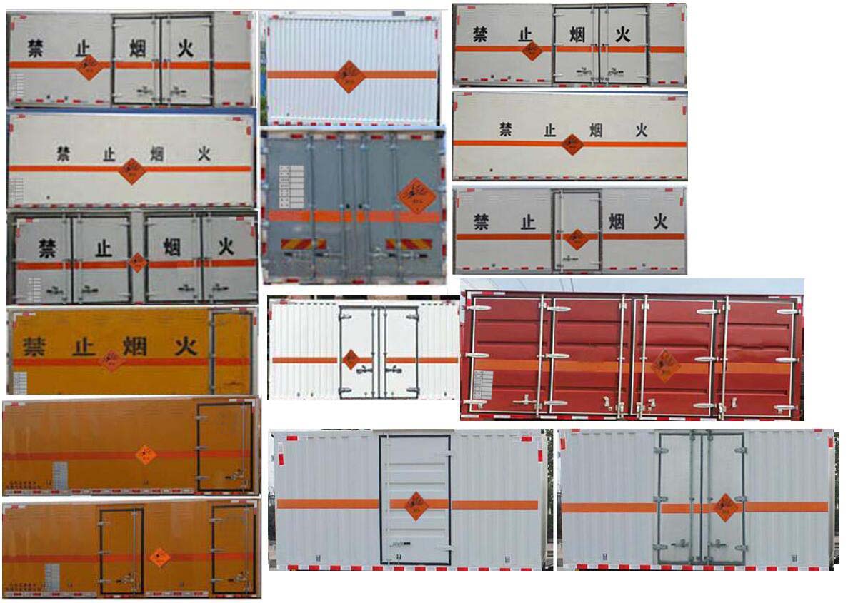 | 备注 | 1、该车用于危险品运输,厢体顶部封闭,不可开启.危险货物运输车辆的类型为EX/II,该车主要用于运输独立容器包装的介质.运输介质类项号:1.1D,1.1D,1.4G,1.1B,1.1B,1.1G,1.1C,1.3C,1.1D,1.1D,1.4G,1.1D,1.1D,1.1B,1.1B,1.3C,1.1C,1.3C,1.1D。该车仅选用4700mm和5000mm轴距底盘,整车长/轴距/前悬/后悬(mm)对应关系为:9250/5000/1430/2820,9250/5000/1400/2850,9050/5000/1430/2620,9050/5000/1400/2650,8650/4700/1430/2520,8650/4700/1400/2550,整备质量(kg)/额定载质量(kg)/人数对应关系为:7870/10000/2,7805/10000/3,7875/9995/2,7810/9995/3。2、侧/后防护材料为Q235,侧防护螺栓连接,后防护焊接连接,截面尺寸120×50mm,下边缘离地高450mm。3、随底盘选装驾驶室前面罩,选装侧窗玻璃;驾驶室顶部中间三个装饰灯为选装件;前雾灯为选装件;驾驶室前脸扰流罩为选装件,选装无车门裙板照片,选装与车身颜色相同的前保险杠。选装侧开门,侧门单开门、侧门双开门、侧门不开门,选装侧门型式及位置,百叶窗,选装瓦楞板。仅选用排气管前置,只装用子午线轮胎,前轮盘式制动器,安装限速装置最高车速80km/h,安装具有卫星定位功能的行驶记录仪;ABS型号/生产厂家:3631010-C2000/东科克诺尔商用车制动系统(十堰)有限公司,EBS5/东科克诺尔商用车制动系统(十堰)有限公司,ABS 8/东科克诺尔商用车制动系统(十堰)有限公司。发动机/油耗值(L/100km):B6.2NS6B210/26.5,DDi50E190-60/27.0。 该车后轴为采用空气悬架.可选装ETC车载装置。转向轮安装爆胎应急防护装置。 | ||