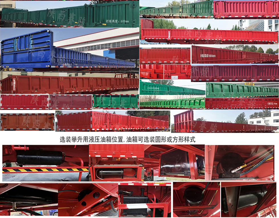 | 备注 | 卸货方式为:侧卸;选装前挡板结构;选装侧面栏板样式,选装侧面带锁杆结构和不带锁杆结构,选装合页样式,选装吊开门,对开门和下开门;选装后部结构;选装号牌板样式;选装大梁异形孔,选装液压油箱位置,油箱可选装圆形或方形样式,选装后组合灯矩形/后雾灯圆形结构;ABS生产企业/型号:广州瑞立科密汽车电子股份有限公司/CM2XL-4S/2M;侧、后防护装置均采用Q235B,与车辆采用焊接,后防护装置的断面尺寸为140mmx55mm,离地高度为460mm车长/轴距/后悬/牵引销至车辆最前端的距离尺寸对应关系(mm): 13000/6880+1310+1310/2300/1200,13000/6780+1310+1310/2380/1220,13000/6680+1310+1310/2350/1350,12500/6480+1310+1310/2100/1300,12000/6280+1310+1310/1800/1300 | ||