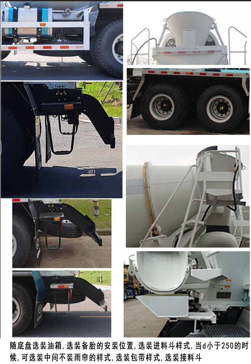 | 备注 | 1.搅动容量为7.7立方米,罐体外形总长度(含封头)5120mm,最大直径2100mm,罐体安装角度为15.4°;2.侧面,后下部防护装置的材料均为:Q235钢板,连接方式均为:螺栓连接;后下部防护装置断面尺寸为:50mm×120mm,离地高度为490mm;3.选装进料斗样式、油箱及备胎安装位置,当d小于250的时候,可选装中间不装雨帘的样式,选装包带样式,选装进料斗;4.安装具有卫星定位功能的行驶记录仪;5.ABS型号/生产厂家:CM4XL-4S/4M,广州瑞立科密汽车电子股份有限公司;6.该车采用CM6D12.360 50发动机的油耗值为37.3L/100km; | ||