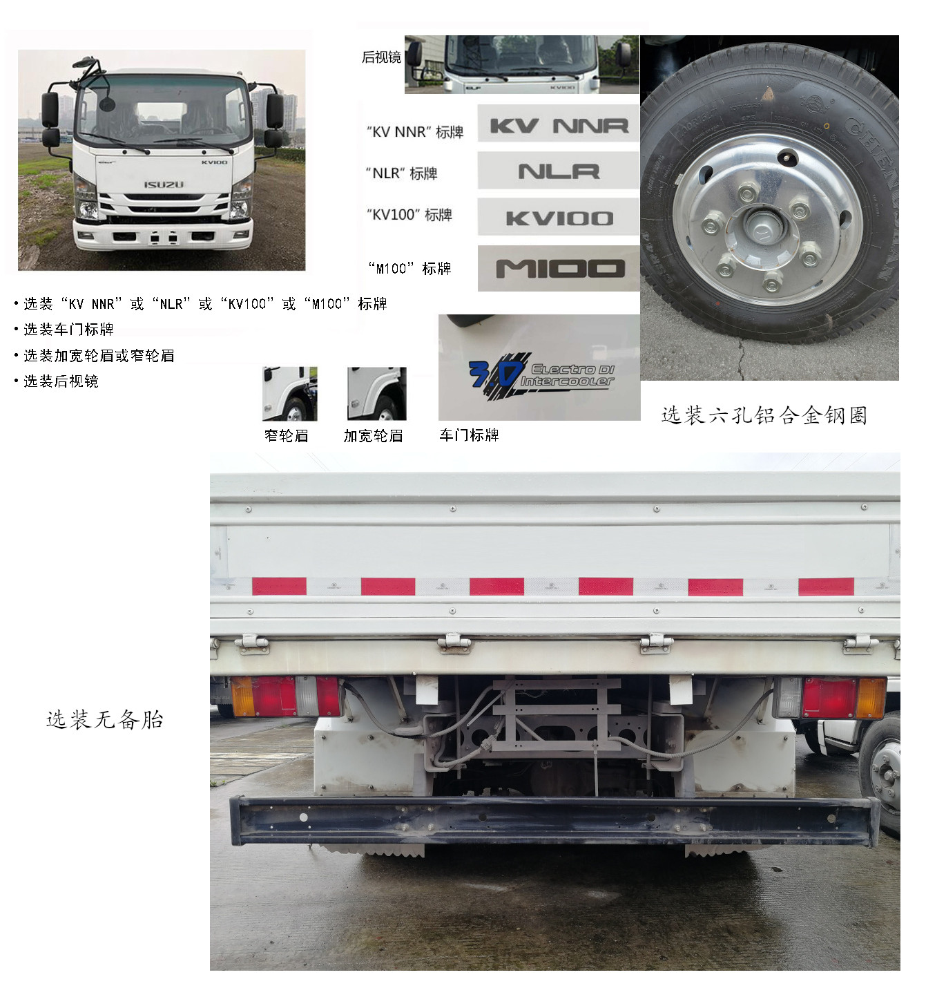 | 备注 | 1、发动机净功率为87kW,发动机型号为4KH1CN6LB,油耗申报值为11.45L/100km;2、侧防护材料:钢板 Q235,连接方式:用螺栓连接在车厢横梁上;后防护材料:钢板Q235,板厚2.0mm,连接方式:后防护支架以螺栓连接在车架纵梁尾端,后防护断面尺寸:139.4×50(mm),离地高度:455mm;3、该车选装制动系统:装液压制动系统时,ABS及其控制器型号/生产企业对应关系为::APG3550500A/浙江亚太机电股份有限公司,CM4YL/广州瑞立科密汽车电子股份有限公司,选装气压制动系统时,ABS及其控制器型号/生产企业对应关系为:CM4XL-4S/4M/广州瑞立科密汽车电子股份有限公司;4、该车选装不同造型、风格进气格栅,选装不同造型、风格后视镜,选装驾驶室后围开窗、盲窗,选装无前下视镜,选装加宽轮眉和窄轮眉,选装不同造型风格、不同材质(铝/铁)轮辋,选装无备胎,选装"KV NNR/NLR/KV100/KV600/M100/M600"标牌,选装车门标牌,选装“100P”或“600P”尾部标识,选装不同风格后轮罩。 | ||