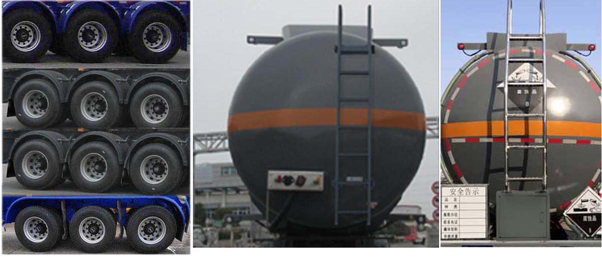 | 备注 | 有效容积38立方米,罐体外形尺寸(mm):外罐长10950外径前φ2058后φ2208.危险货物运输车辆的类型为:AT型,危险品类项号为:8.该车装空气悬挂,选装前部带爬梯、挡泥板、正后带箱子及后爬梯在箱上、罐体顶部护栏、碳钢后防护上横梁及牌照板结构、尾部侧面无操作箱或一侧带操作箱、侧面防护工具箱位置及灭火器安装位置 .ABS厂家/型号:威伯科(上海)管理有限公司/4005000880,浙江万安科技股份有限公司/VIE-TABS Ⅱ(4S2M),广州瑞立科密汽车电子股份有限公司/CM2XL-4S/2M,广州市西合汽车电子装备有限公司/XH-GQ4S2M-E01.EBS厂家,型号:克诺尔商用车系统企业管理(上海)有限公司,K11061XVXX或瀚德汽车产品(苏州)有限公司,4S2M或威伯科(上海)管理有限公司, 4801020640或浙江万安科技股份有限公司,VIE TEBS-I.侧防护材料为铝合金,螺栓连接;后防护材料为铝合金,螺栓连接,选装后防护材料Q235,螺栓连接,后防护断面尺寸80×150mm,离地高495mm.采用适用于牵引危险品运输半挂车的牵引车. | ||
