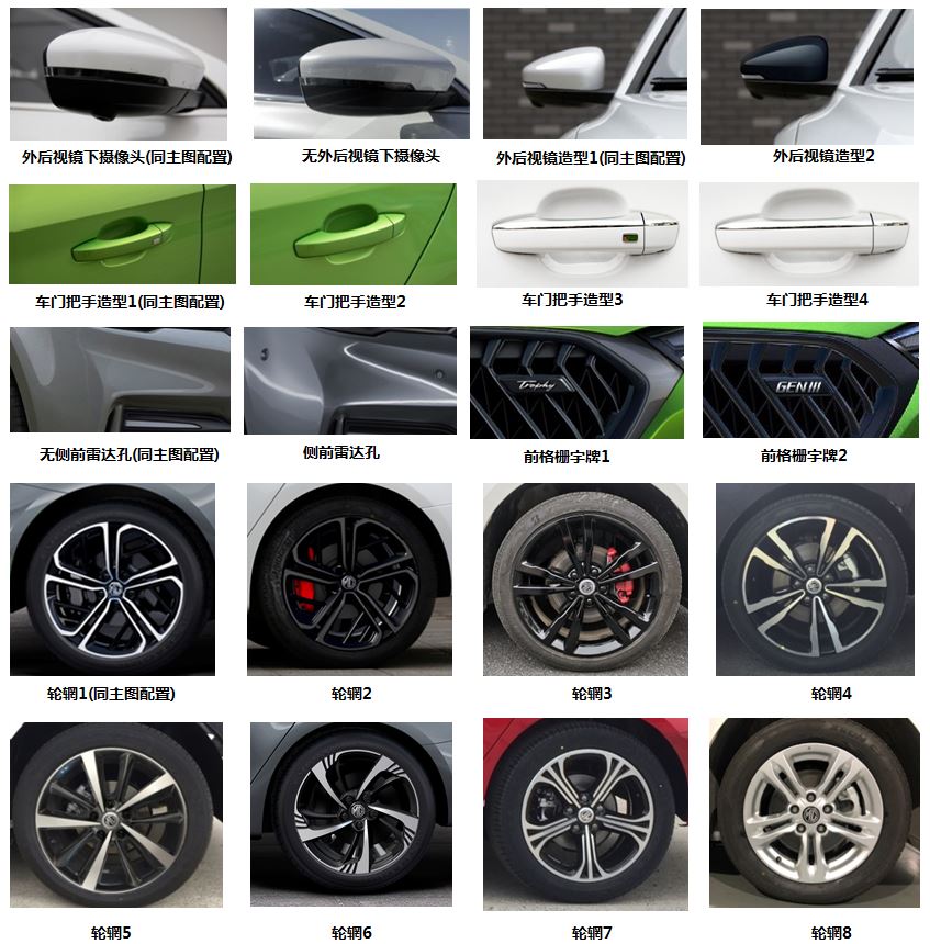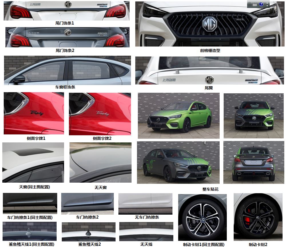 | 备注 | 选装:前格栅造型、车窗框饰条、尾翼、尾门饰条、前格栅字牌、轮辋、车门把手、侧面字牌、外后视镜、车门防擦条、鲨鱼鳍天线、制动卡钳、侧前雷达孔、整车贴花,选装无:外后视镜下摄像头、车门防擦条、鲨鱼鳍天线、天窗。ABS型号及生产企业:MK100、大陆泰密克汽车系统(上海)有限公司。发动机净功率:133kW。 | ||