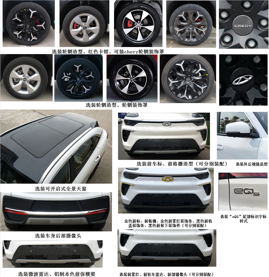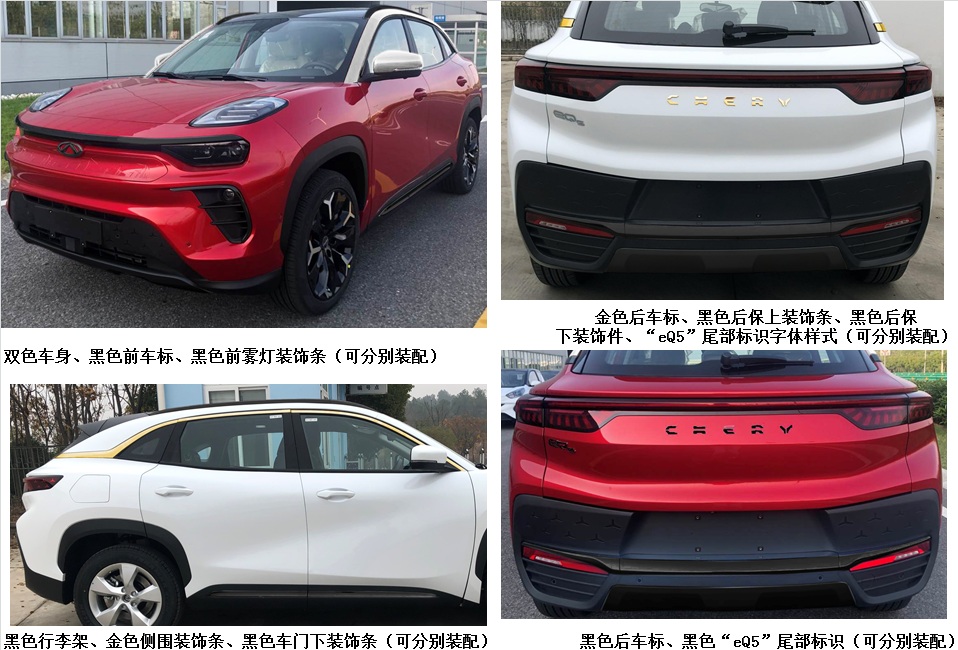 | 备注 | 选装轮辋造型、红色卡钳、轮辋装饰罩、可开启式全景天窗、前车标造型、前格栅造型、外后视镜造型、车身后部摄像头、金色前车标、金色前雾灯装饰条、黑色前机盖装饰条、黑色保险杠下装饰件、微波雷达、铝制本色前保横梁、前雾灯、前驻车雷达、车身前部摄像头、双色车身、黑色前车标、黑色前雾灯装饰条、黑色行李架、金色侧围装饰条、黑色车门下装饰条、金色后车标、黑色后保上装饰条、黑色后保下装饰条、“eQ5”尾部标识字体样式、黑色后车标、黑色“eQ5”尾部标识。ABS系统生产厂家为浙江亚太机电股份有限公司,对应的型号分别为3550AFA,3550AEU。VIN号LURMCVEG×××××××××对应的驱动电机型号为112AAR,轮胎型号225/60R18对应的前后轮距为1635mm/1635mm。储能装置种类为三元锂离子电池,单体生产企业为天津市捷威动力工业有限公司,总成生产企业为芜湖奇达动力电池系统有限公司。 | ||