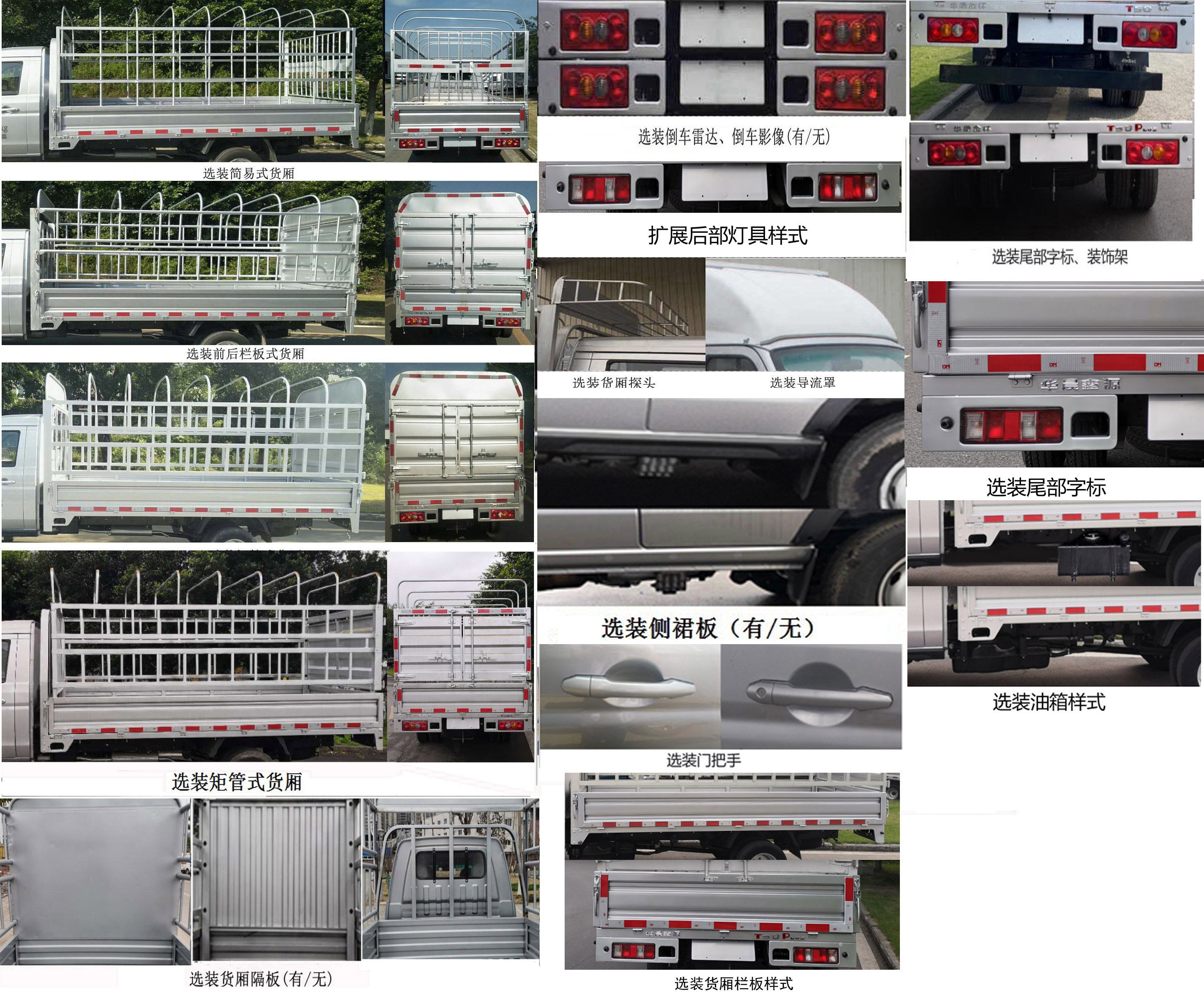 | 备注 | 1.选装(MP5,简易式/前后栏板式圆管/矩管式货厢,货厢前部隔板,货厢探头,导流罩,倒车雷达,倒车影像,侧裙板,后部灯具样式,装饰架,尾部字标,门把手样式,油箱样式,货厢栏板样式);2.装配简易式货厢对应整备质量:1595kg;3.发动机型号SWE20M,最大净功率93kW,油耗申报值7.9L/100km;4.车厢底板到顶部高度1710mm;5.ABS型号/生产企业:YF8/武汉元丰汽车电控系统有限公司;6.该车型符合国六标准b限值要求. | ||