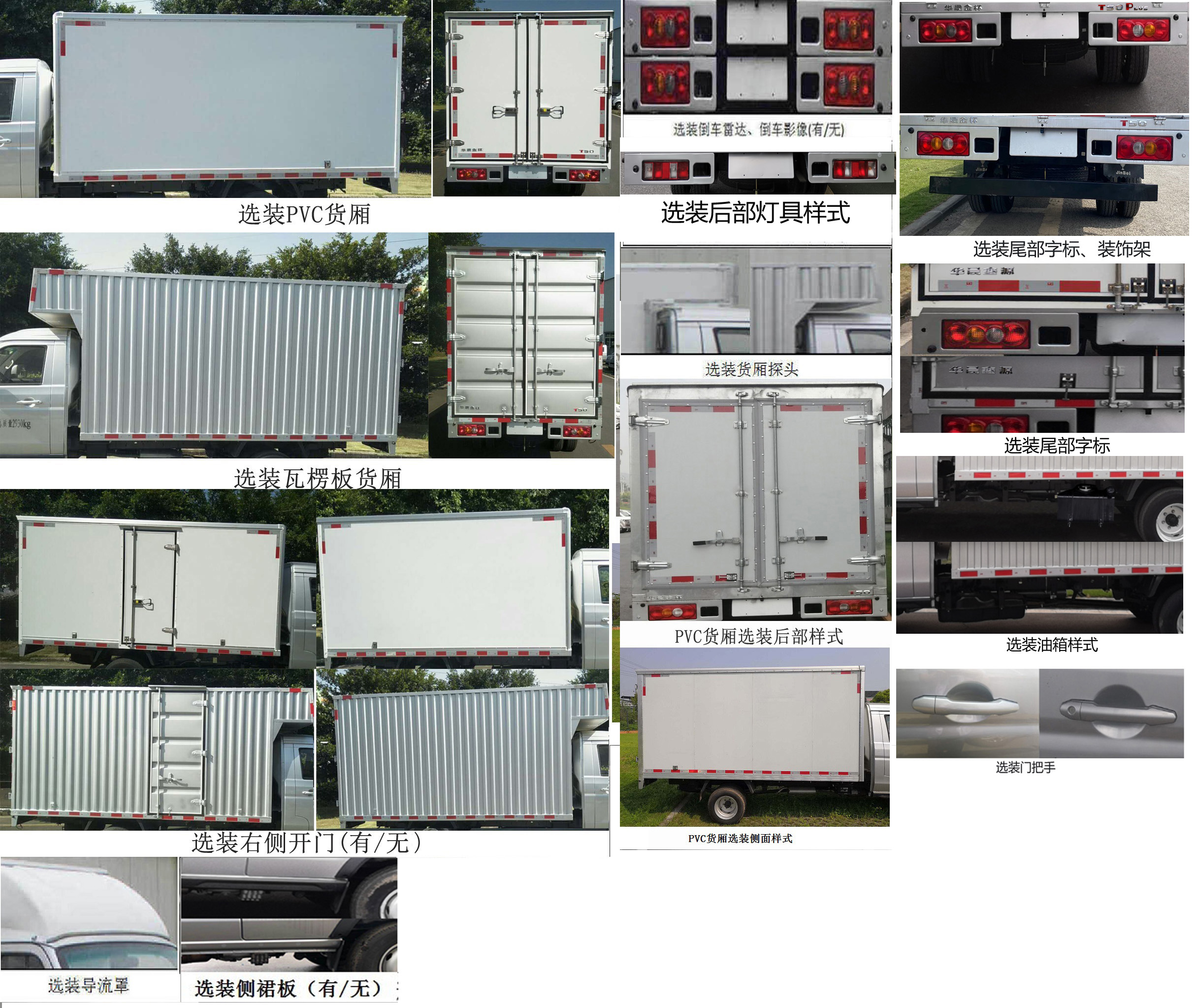 | 备注 | 1.车厢顶部封闭,不可开启;2.选装(MP5,PVC/瓦楞板货厢,侧开门,货厢探头,导流罩,倒车雷达,倒车影像,PVC货厢后部/侧面样式,侧裙板,后部灯具样式,装饰架,尾部字标,门把手样式,油箱样式);3.发动机型号SWE20M,最大净功率93kW,整备质量1660kg,1715kg对应油耗申报值为8.3L/100km,8.7L/100km;4.ABS型号/生产企业:YF8/武汉元丰汽车电控系统有限公司;5.该车型符合国六标准b限值要求. | ||