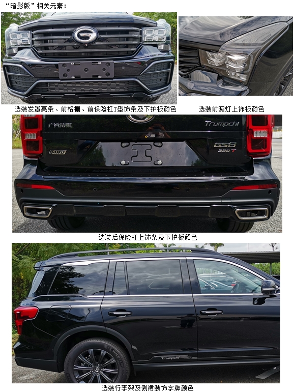| 备注 | 发动机最大净功率:153kW;ABS型号:ESP9,ABS生产企业:博世汽车部件(苏州)有限公司;选装:普通天窗,全景天窗,轮辋,前组合灯,侧风窗及后风窗玻璃,外后视镜(带摄像头),前置摄像头,前雾灯,前雷达,自适应巡航雷达,自动泊车雷达,前格栅、前保险杠, “暗影版”相关元素(包含发罩亮条、前格栅、前保险杠T型饰条及下护板等),黑色喷涂轮辋,"20万台纪念版"字牌. | ||